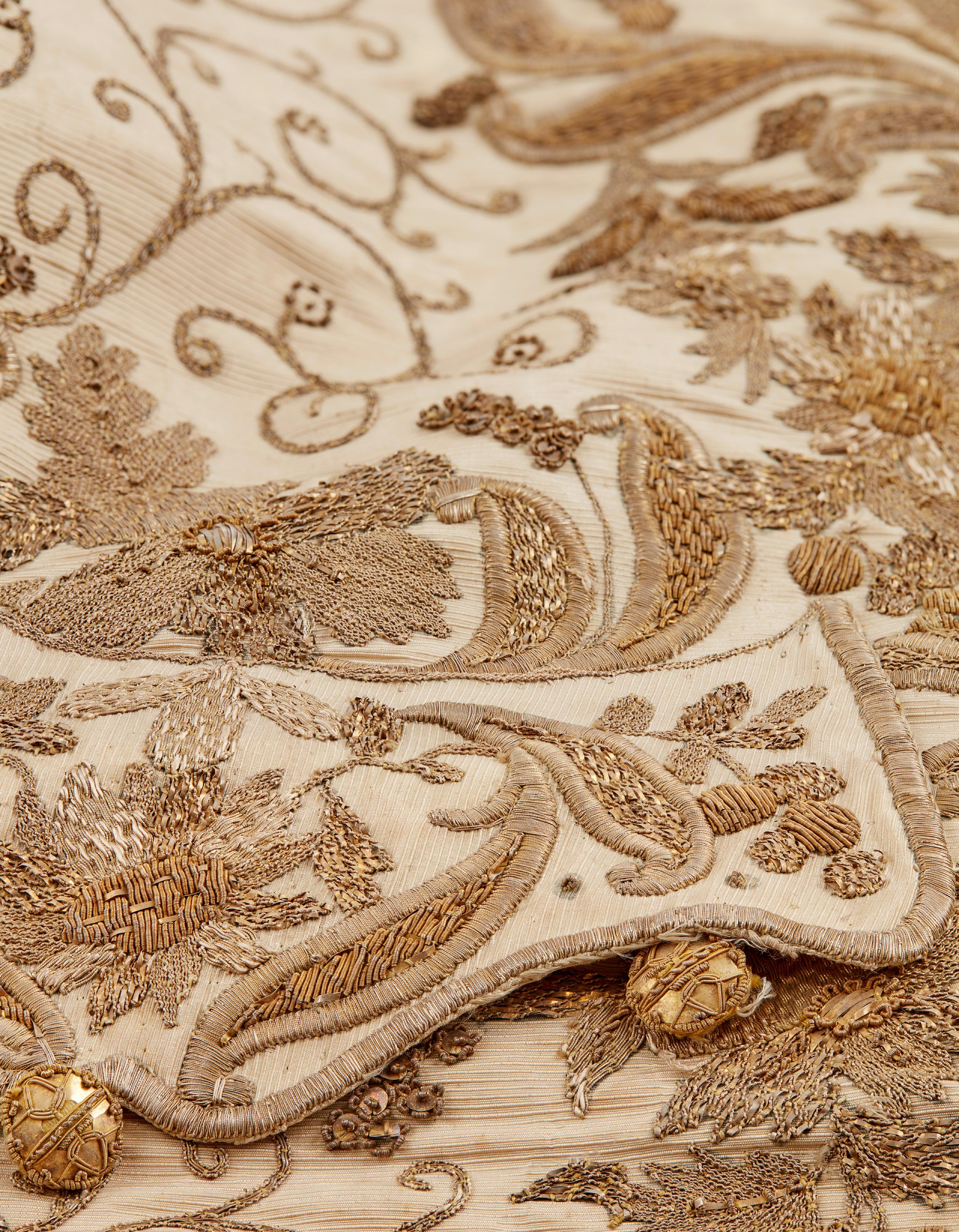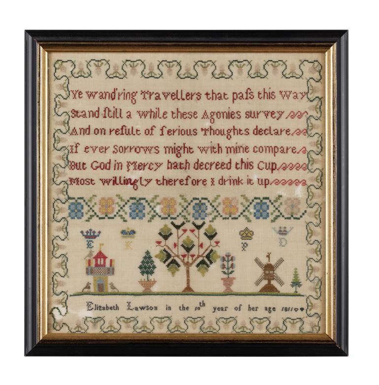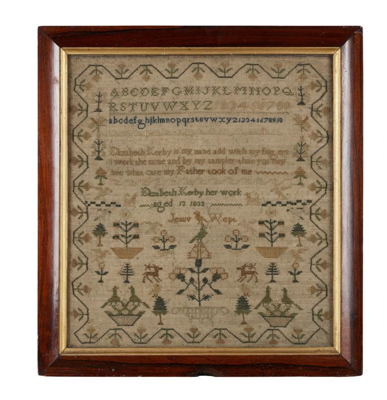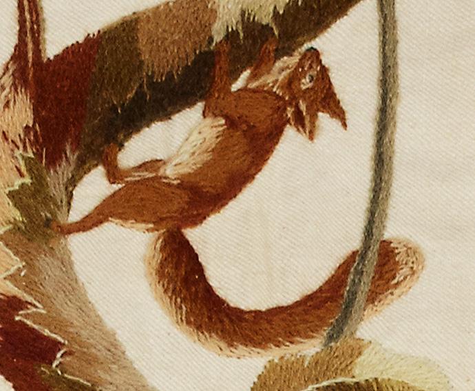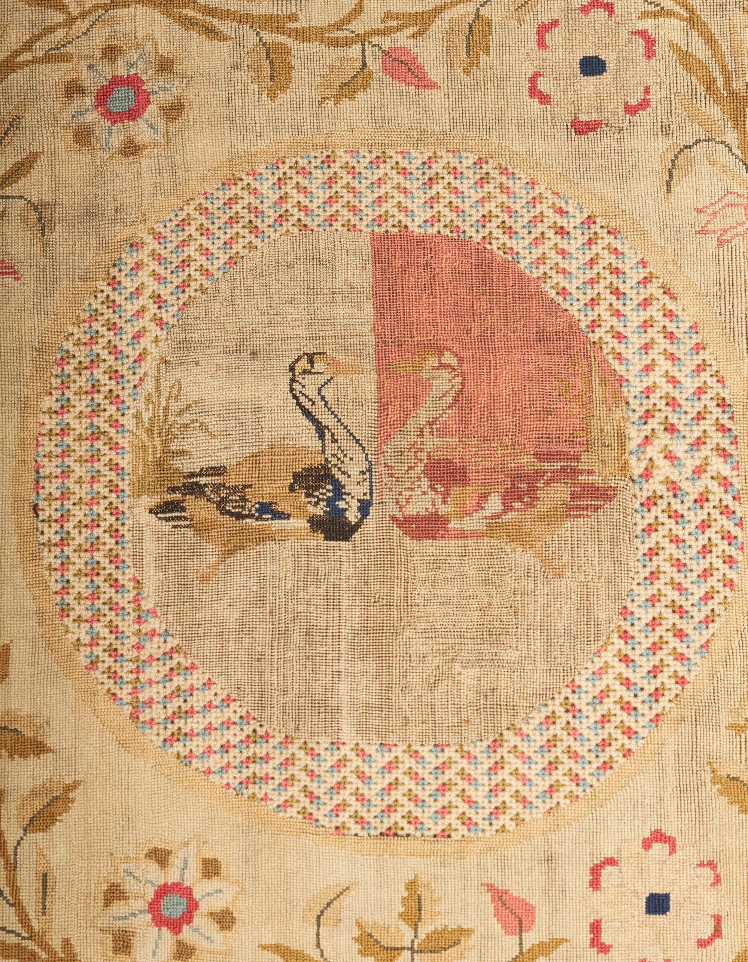 Note: This panel was originally part of a long bed valance, and the motifs employed appear frequently on valances in the late 16th and early 17th centuries. Some images, like the hen pecking the worm, appear in emblem books which were frequently used as a source for designs. These emblems were often accompanied by moral sayings or poems which would have been understood by the educated at that time. Even today we recognise ‘the early bird catches the worm’.