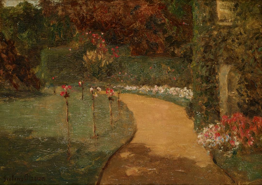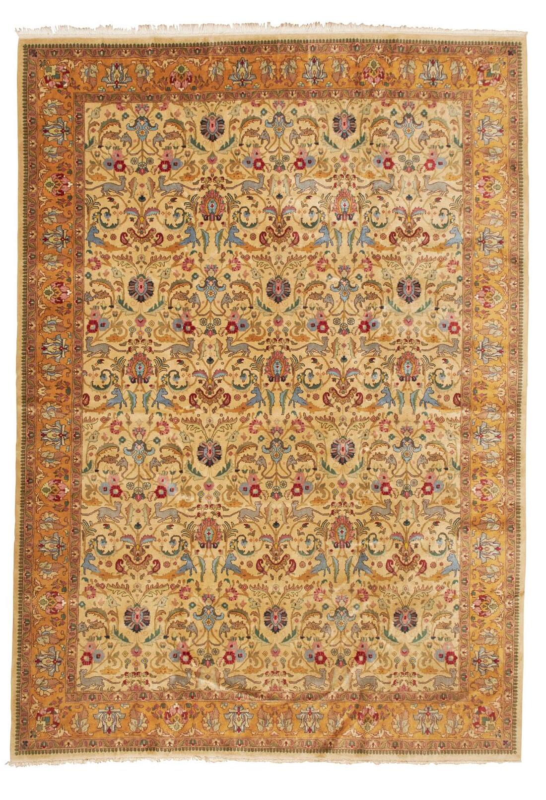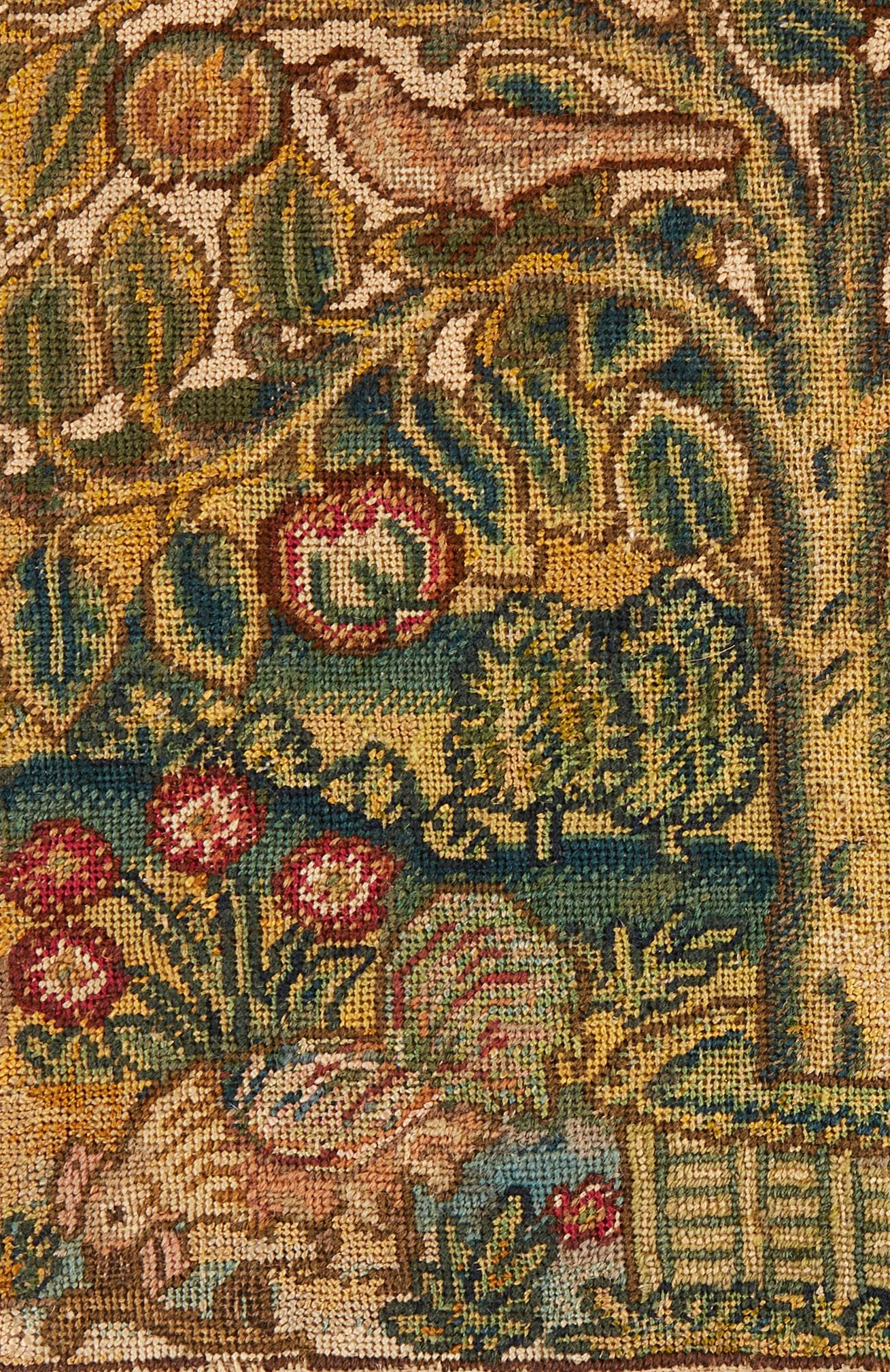 worked in wool and silk with a central tree bearing fruit with a bird perched amongst the branches; flanked by large flower-filled vases; the background filled with parterres and formal gardens, with a church in the distance, and a domed pergola with a rose walkway and trellis arch to the edges; the foreground with animals including a squirrel, rabbits, a tortoise, a hen pecking a worm, and a fox with its kit; all within a brown line border