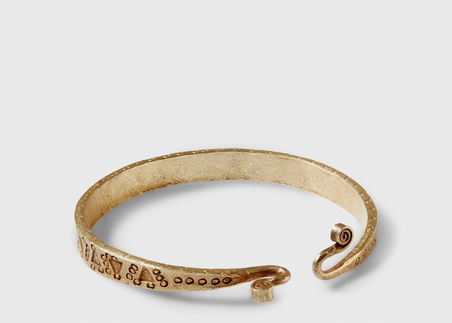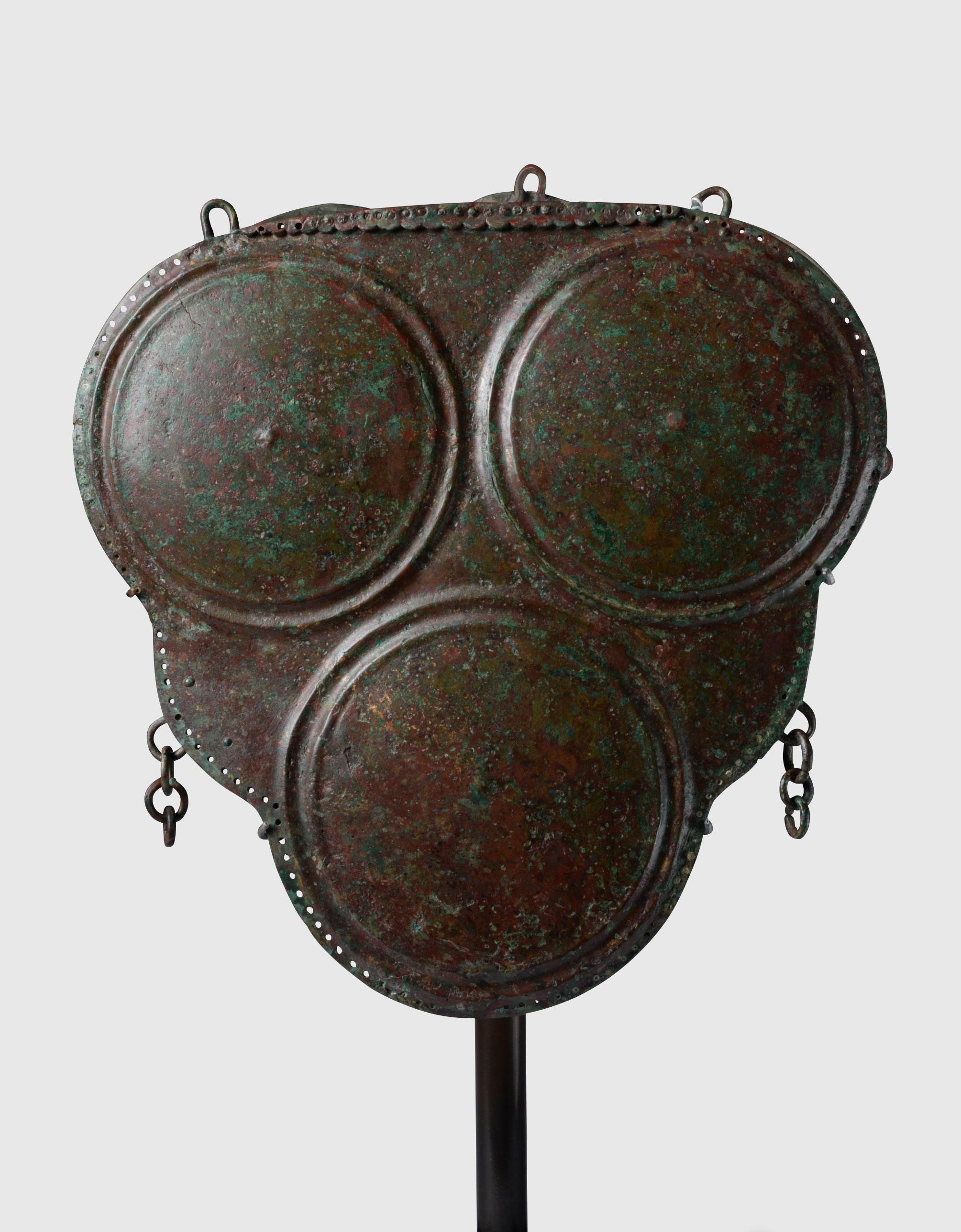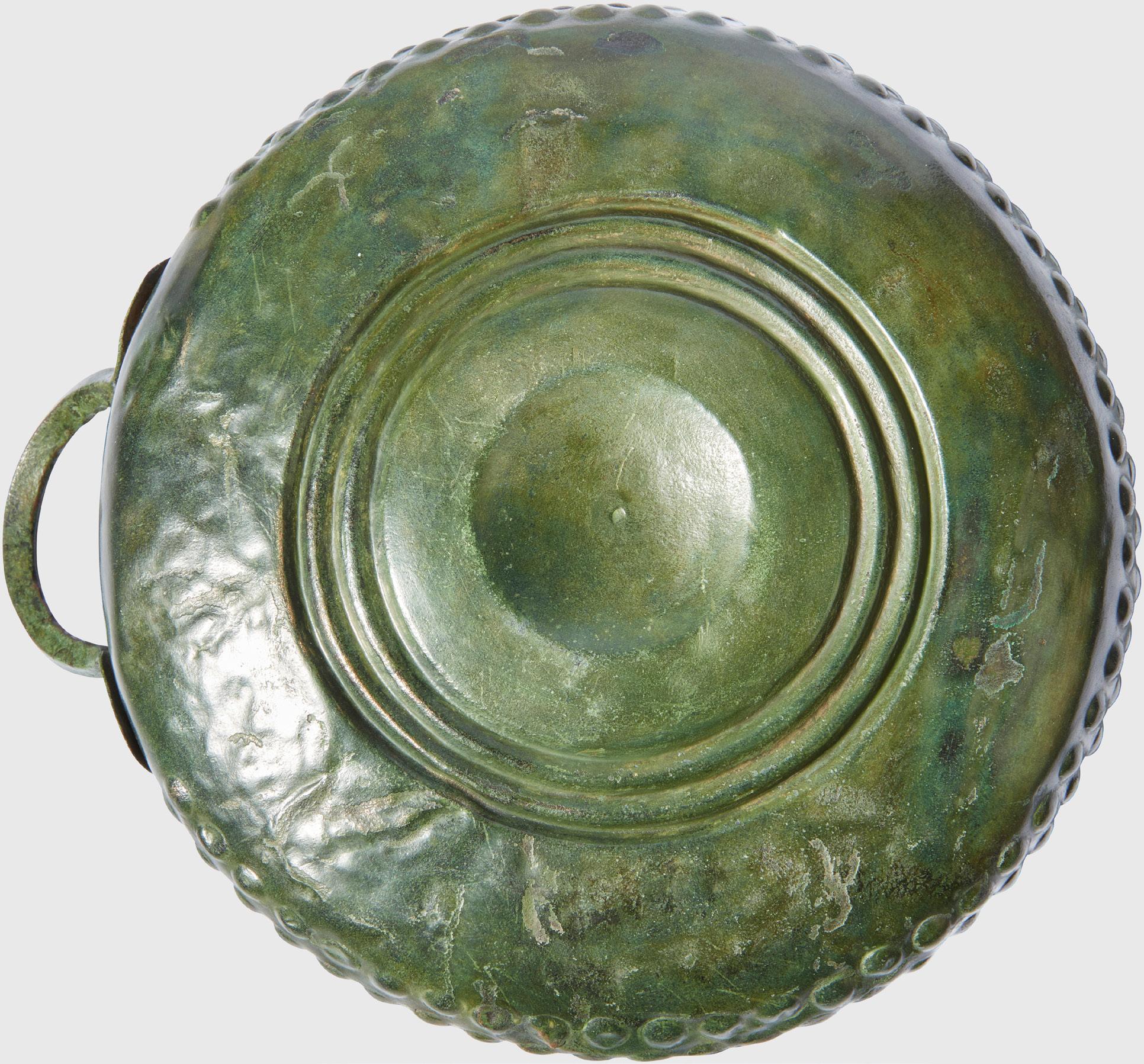 hammered bronze sheet, with a flaring rim and short neck above a rounded shallow body adorned with dual horizontal bands of punched circles, the underside with a concave base bordered by three chased concentric bands, the handle formed separately and affixed with a squared bronze pin at each end, displaying a rich green patination