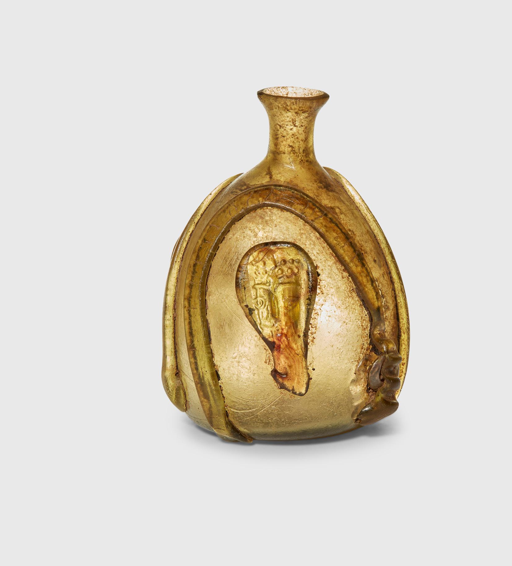 EASTERN MEDITERRANEAN, 4TH - 6TH CENTURY A.D. blown and applied glass, of amber colour, the bottle sitting on a recessed base, the shoulders tapering to a slender neck and subtly everted rim, the body decorated with a series of three (>?<) crescents of trail within which sit applied human faces