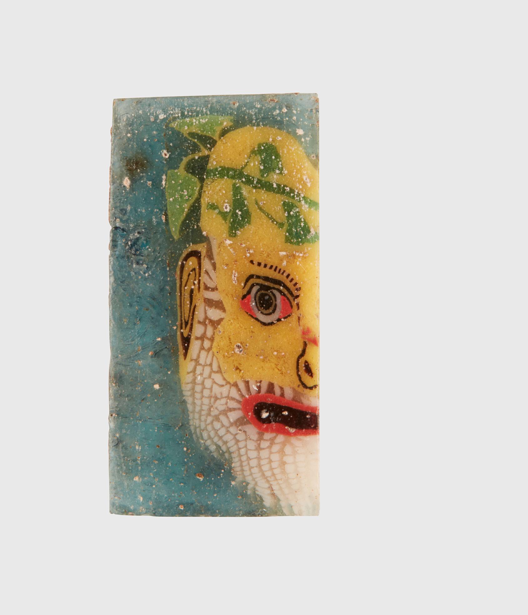 EGYPT, PTOLEMAIC PERIOD, 1ST CENTURY B.C. - 1ST CENTURY A.D. mosaic glass, on a turquoise ground, depicting Silenos or a new comedy actor wearing a vine wreath