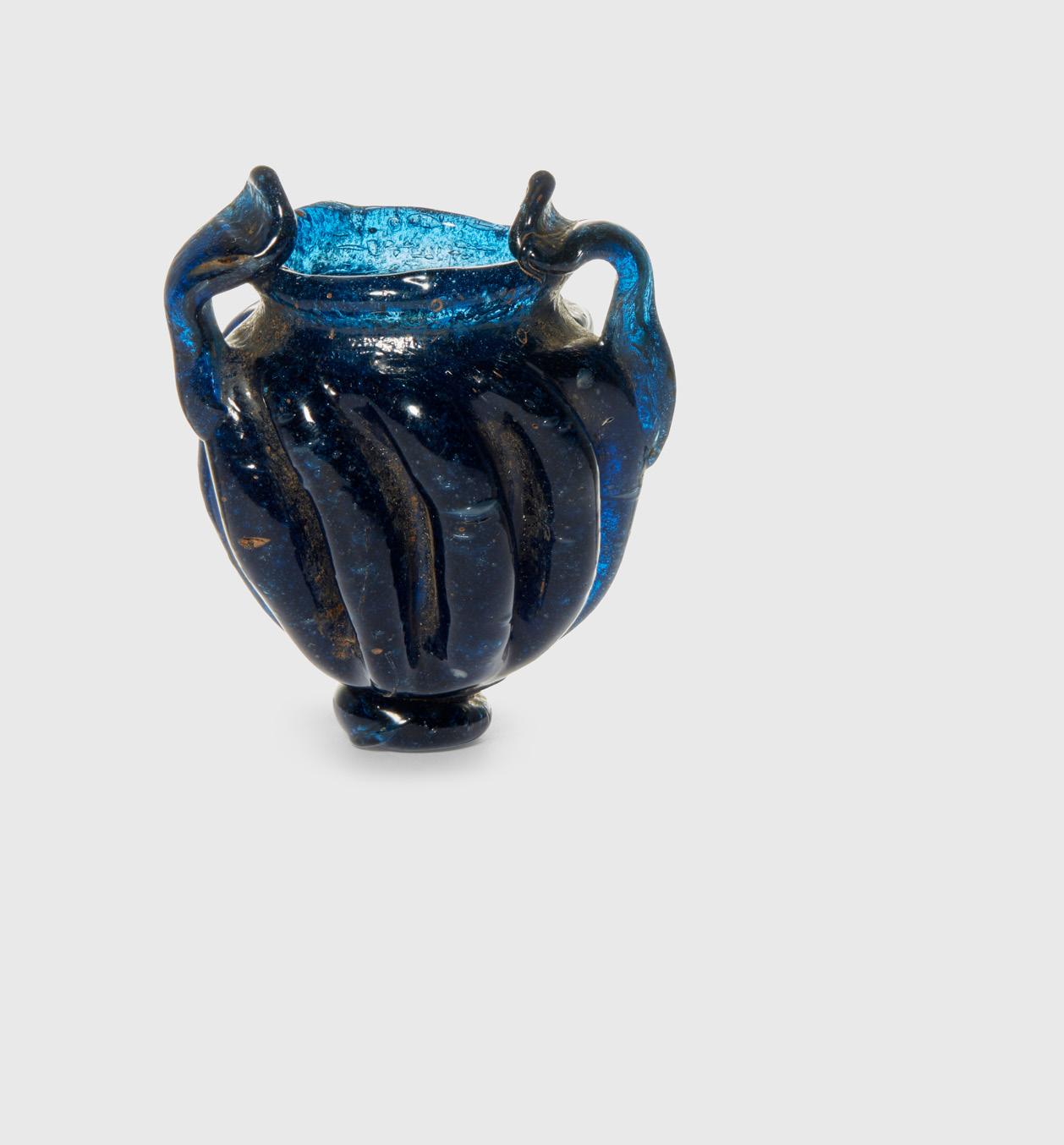 ANCIENT SASSANID MINIATURE BLUE GLASS BOTTLE NEAR EAST, FIRST HALF OF THE FIRST MILLENNIUM A.D. rising from a small discoid foot, the piriform body with raised ribbing running diagonally upwards, short neck and flaring rim, dual small strap handles, the colour a sapphire blue when applied to light