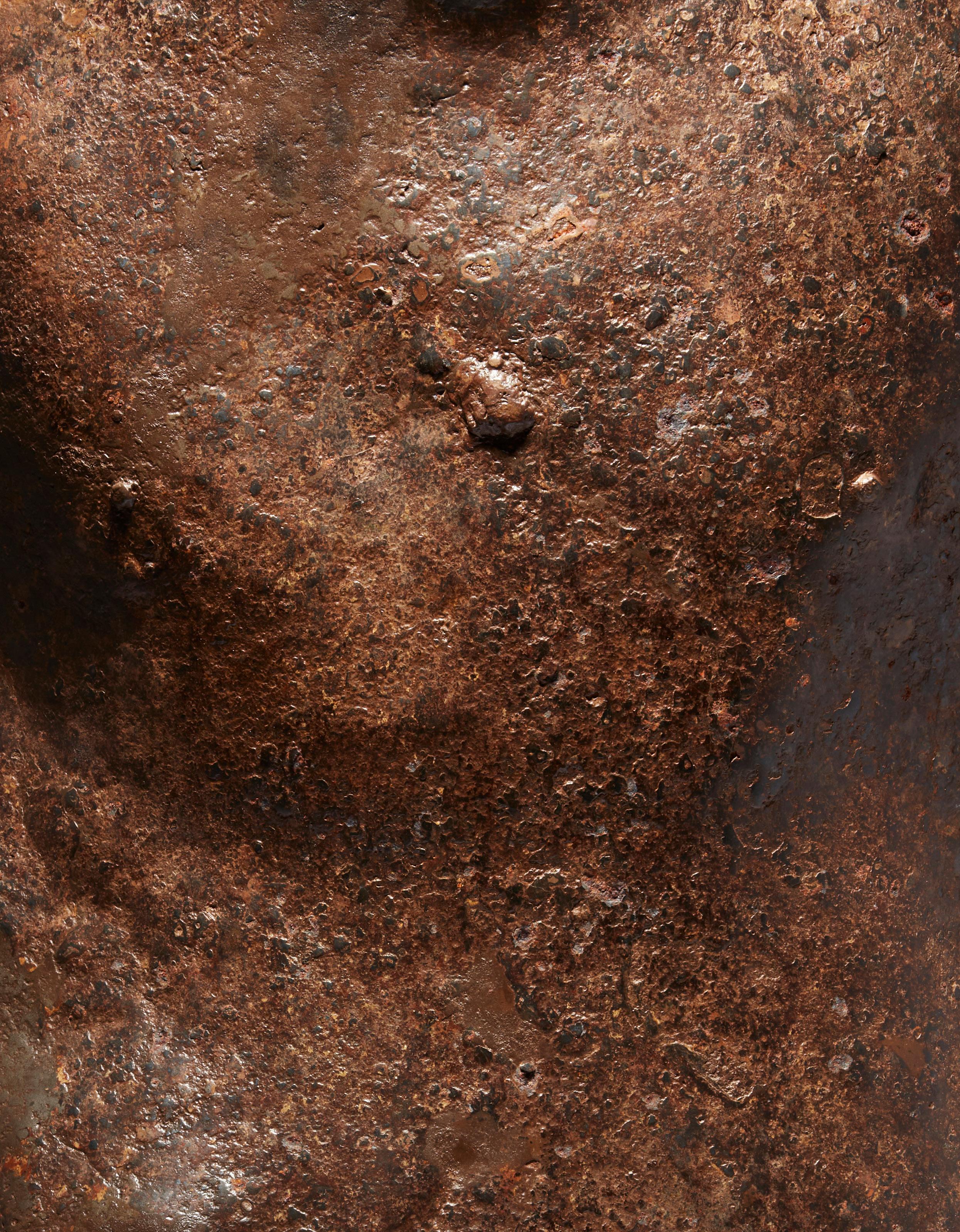 displaying a gunmetal patina, the form sculpted by the intense heat and melting during its atmospheric entry, raised on a custom mount