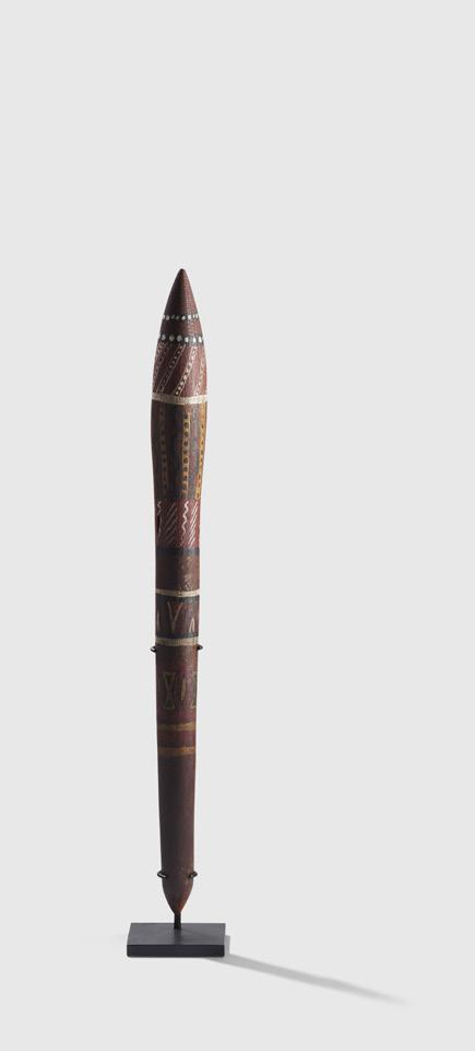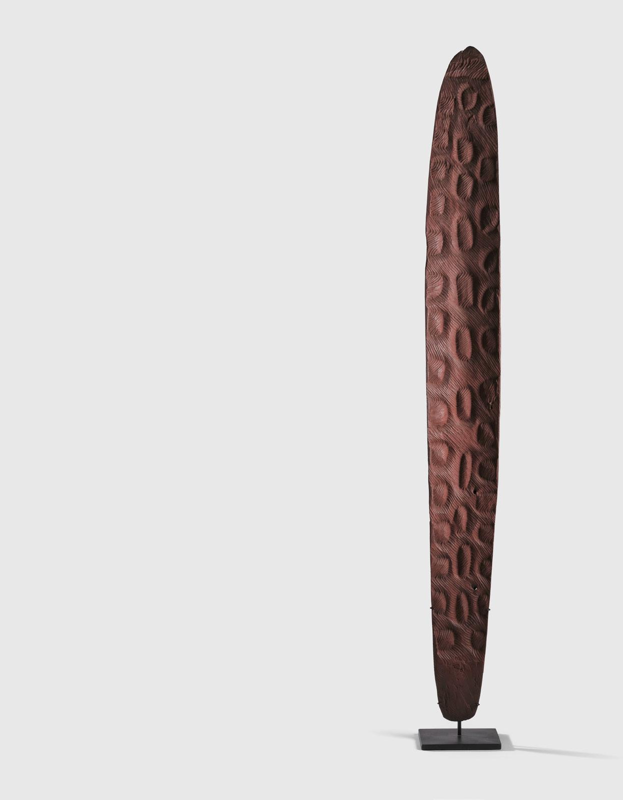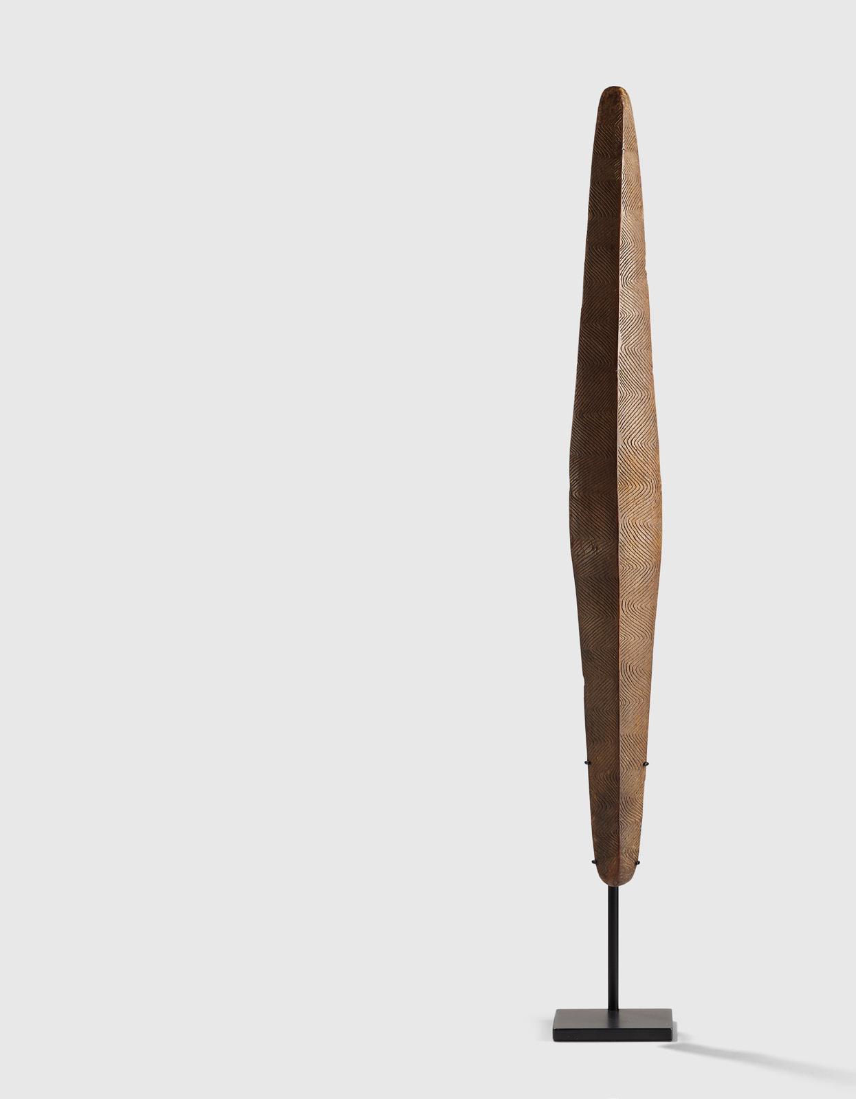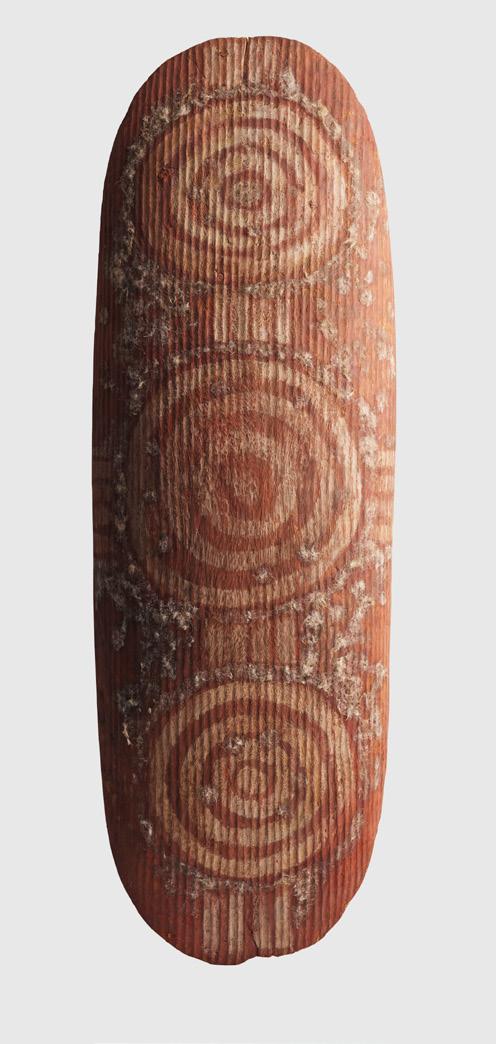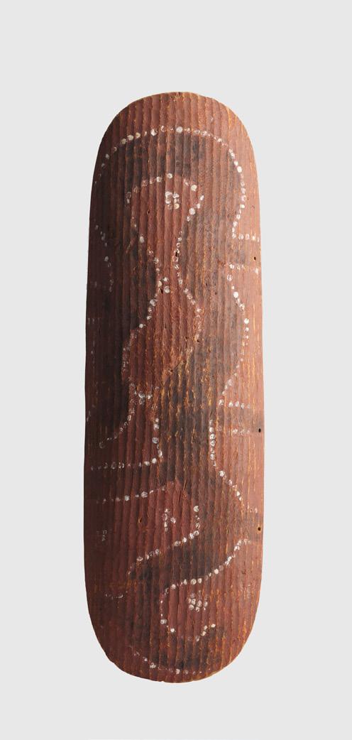 At its heart lies an outstanding selection of shields from diverse regional traditions, alongside finely crafted woomeras, clubs, boomerangs and other objects distinguished by their balanced proportions, graceful contours and the harmonious integration of form and function. Complementing these are works of art that draw upon ancestral traditions while expressing the continuing vitality of First Nations creativity, including pieces by celebrated figures such as Dick Nguleingulei Murrumurra.