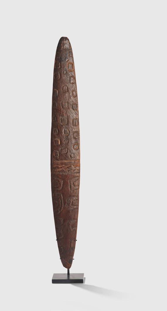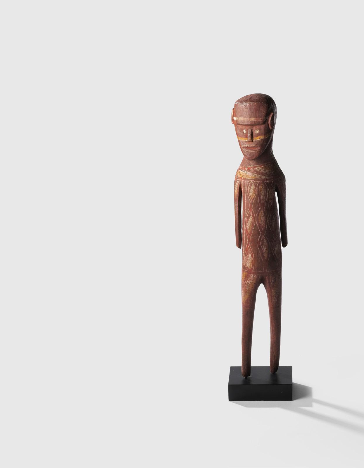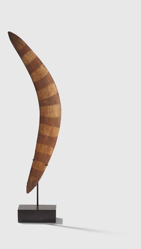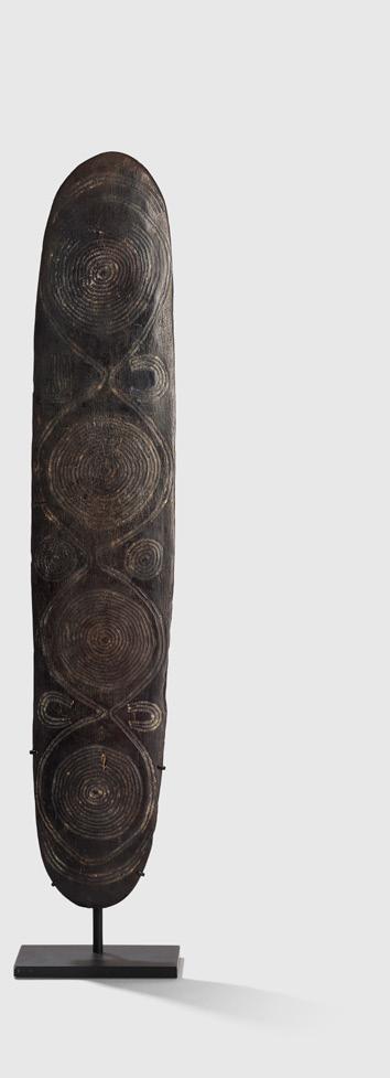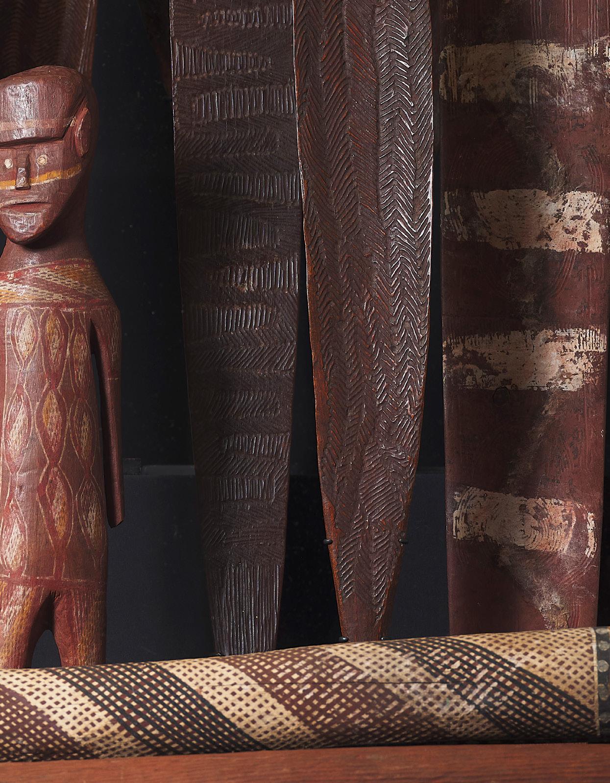 At its heart lies an outstanding selection of shields from diverse regional traditions, alongside finely crafted woomeras, clubs, boomerangs and other objects distinguished by their balanced proportions, graceful contours and the harmonious integration of form and function. Complementing these are works of art that draw upon ancestral traditions while expressing the continuing vitality of First Nations creativity, including pieces by celebrated figures such as Dick Nguleingulei Murrumurra.