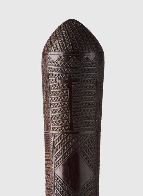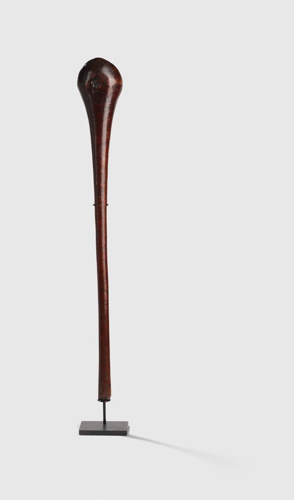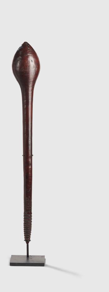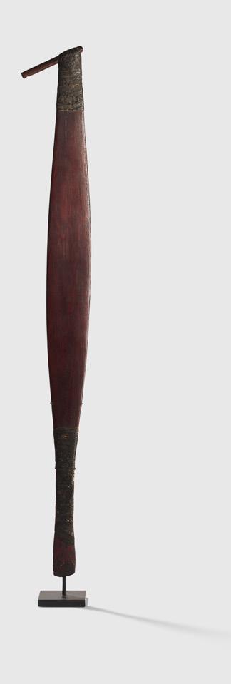 wood and pigment, of long elliptical form, decorated with zigzag motifs composed of a series of longitudinal grooves divided into three sections, coloured with red and white ochre, the reverse adorned with vertical bands arranged in nine sections and bordered by horizontal grooves, fine patination and wear to the handle indicative of use, accompanied by a bespoke mount for wall display
