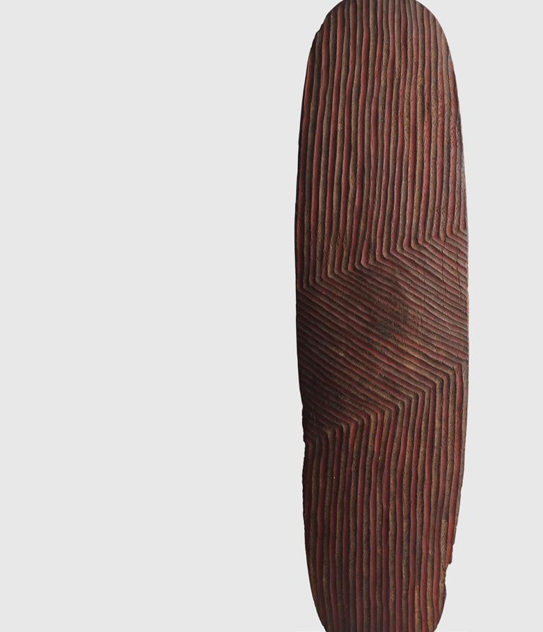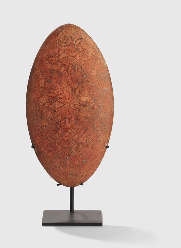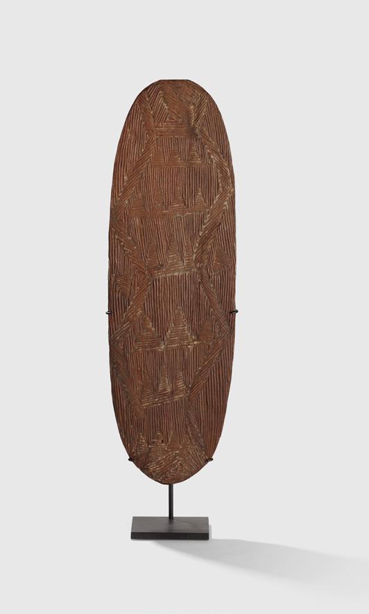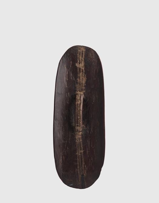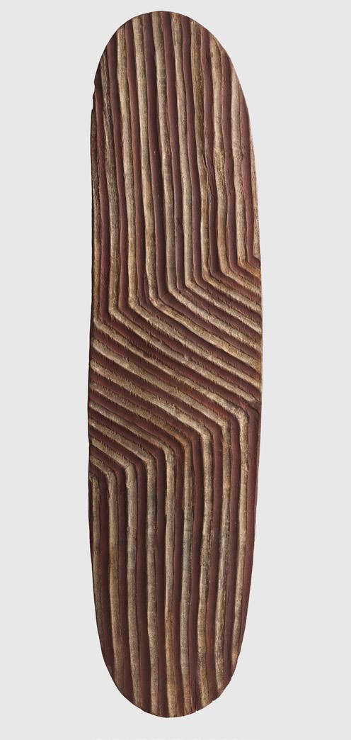 carved wood and natural earth pigments, elongated oval shield, the obverse decorated with red ochre, vertical fluting and incised diagonal striations arranged in broad bands, the reverse with square and line engraving and unadorned with red ochre, accompanied by a bracket for wall mounting