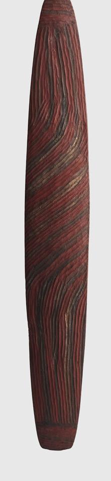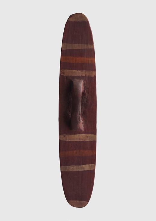 carved wood and pigment, of long elliptical form, decorated with zigzag patterns consisting of a series of longitudinal grooves divided into three sections, coloured with red and white ochre, accompanied by a backet for wall mounting
