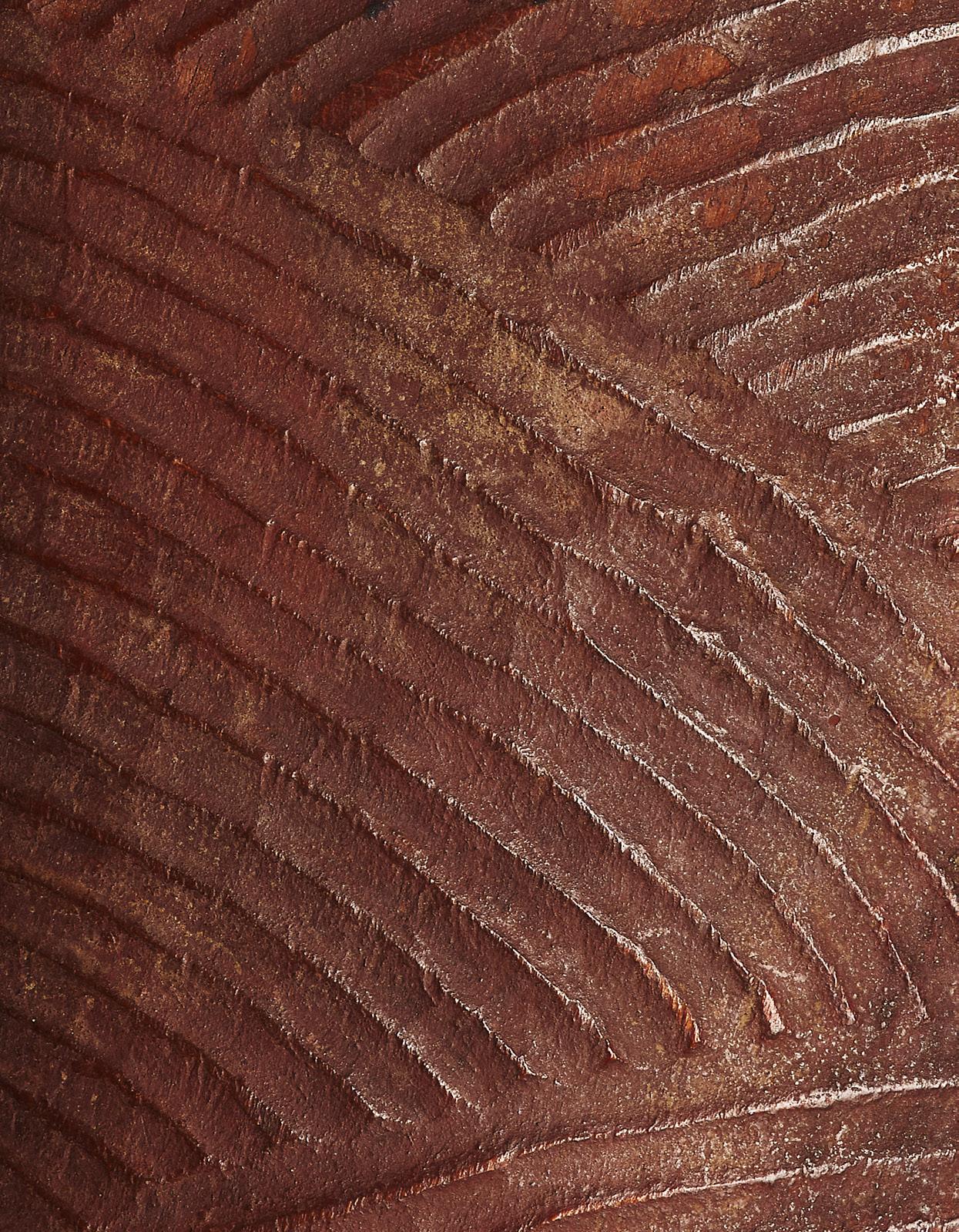 carved wood and pigment, of elliptical form, the obverse engraved with fluting and featuring a motif of alternating ochre and black sweeping bands, the reverse with an integral handle, raised on a bespoke mount designed for wall installation
