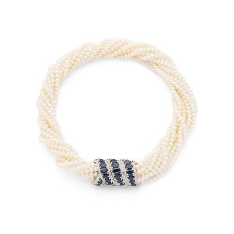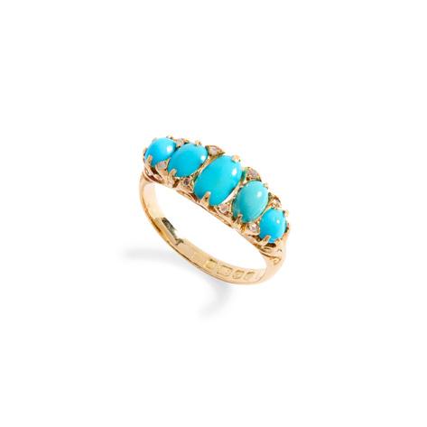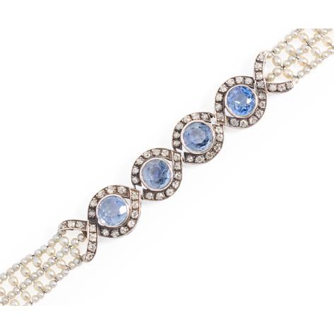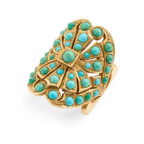 Of hinged design, the central turquoise and seed pearl flower motif in scrolling twist setting, pavé-set with graduated cabochon turquoise and seed pearls, stamped 9c