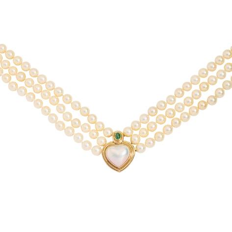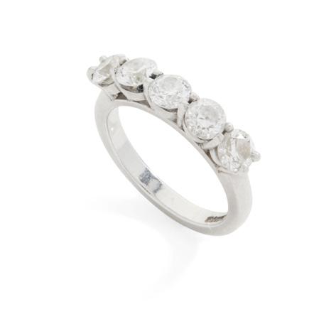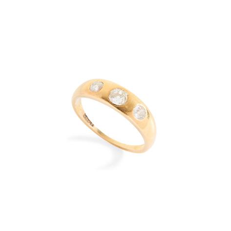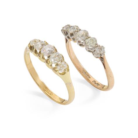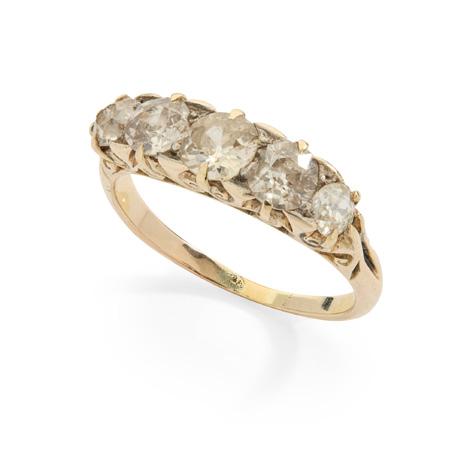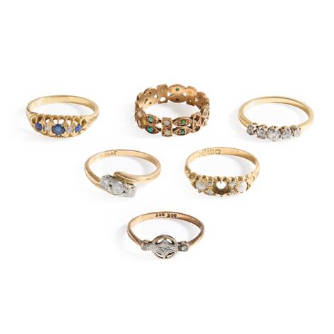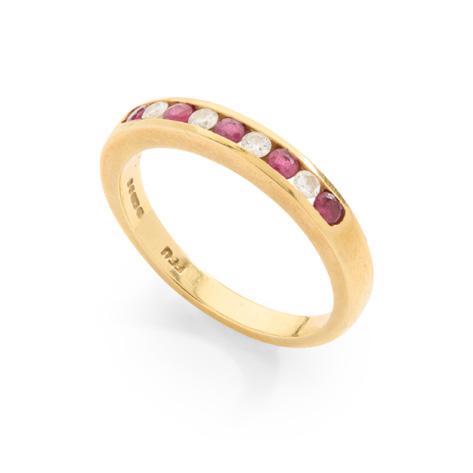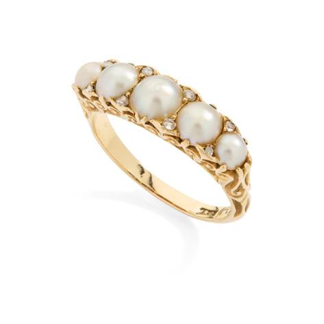 Claw-set with a row of graduated half-pearls, with diamond chip detail, plain band, stamped 18CT