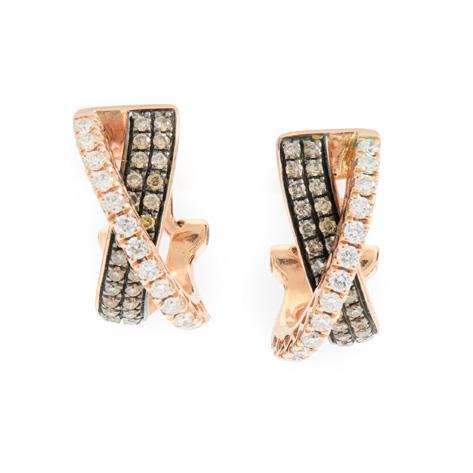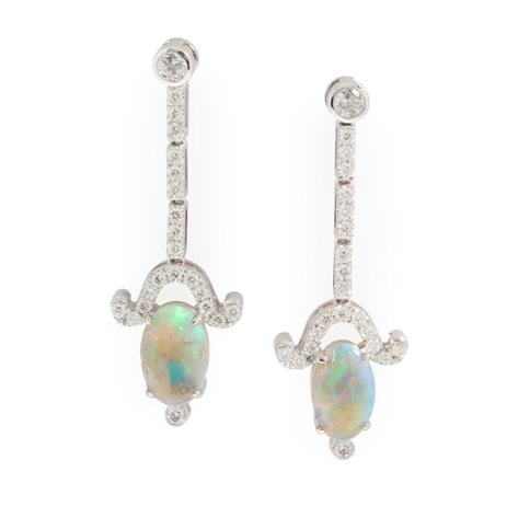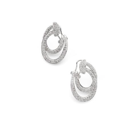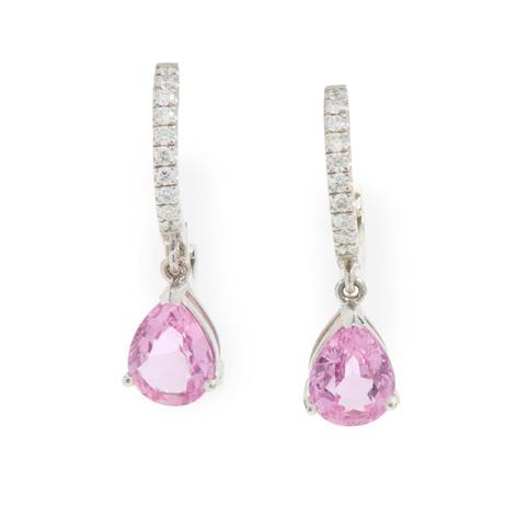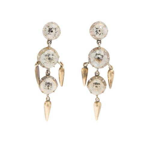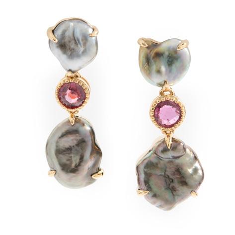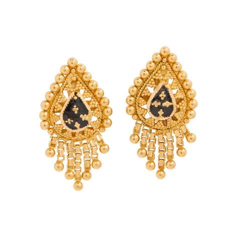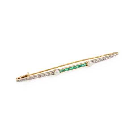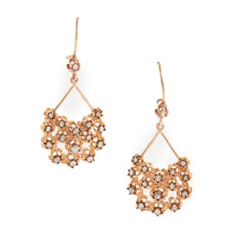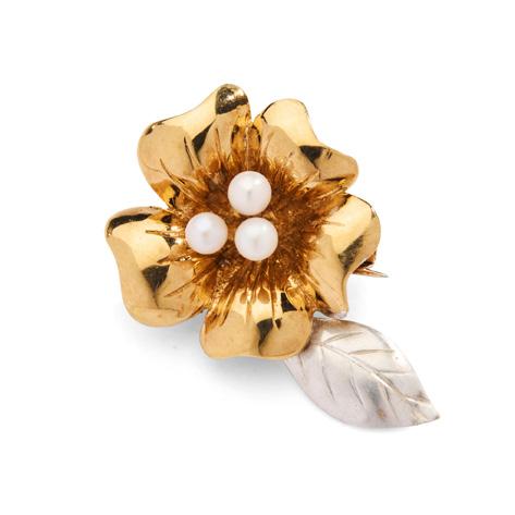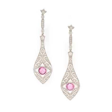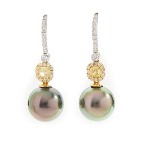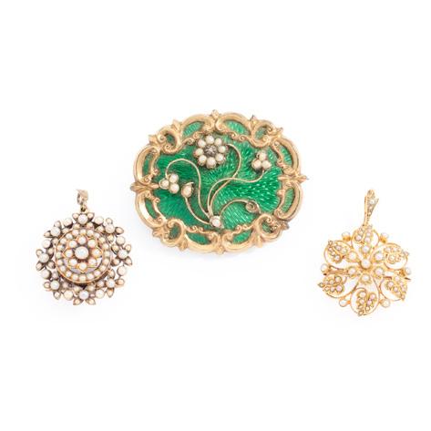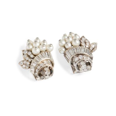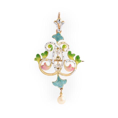 The central openwork navette set with a circular mount flanked by two old-cut diamonds, within interlocking white polka dot enamel scrolls, with colourfully enamelled foliate detail, suspending a cultured pearl drop, unmarked