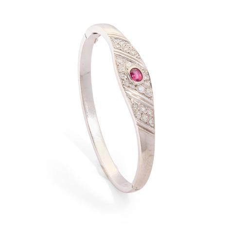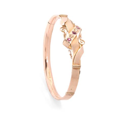AN EDWARDIAN 9CT GOLD RUBY AND DIAMOND BANGLE