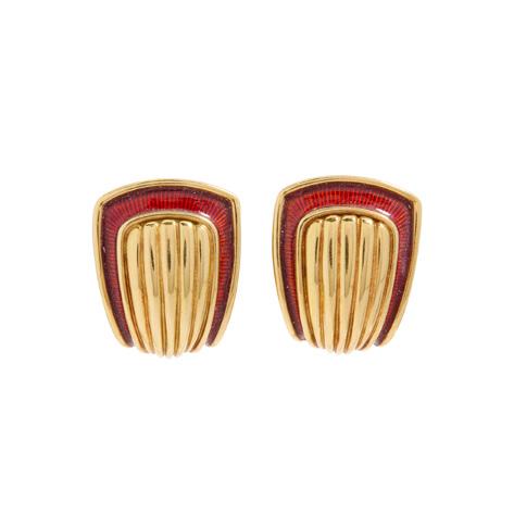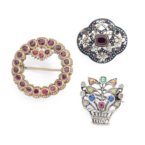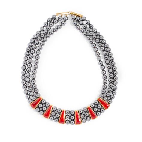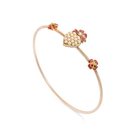 The central pavé-set seed pearl heart motif surmounted by a red enamel bow, set to either side with a red enamel flower motif, concealed hook clasp, unmarked