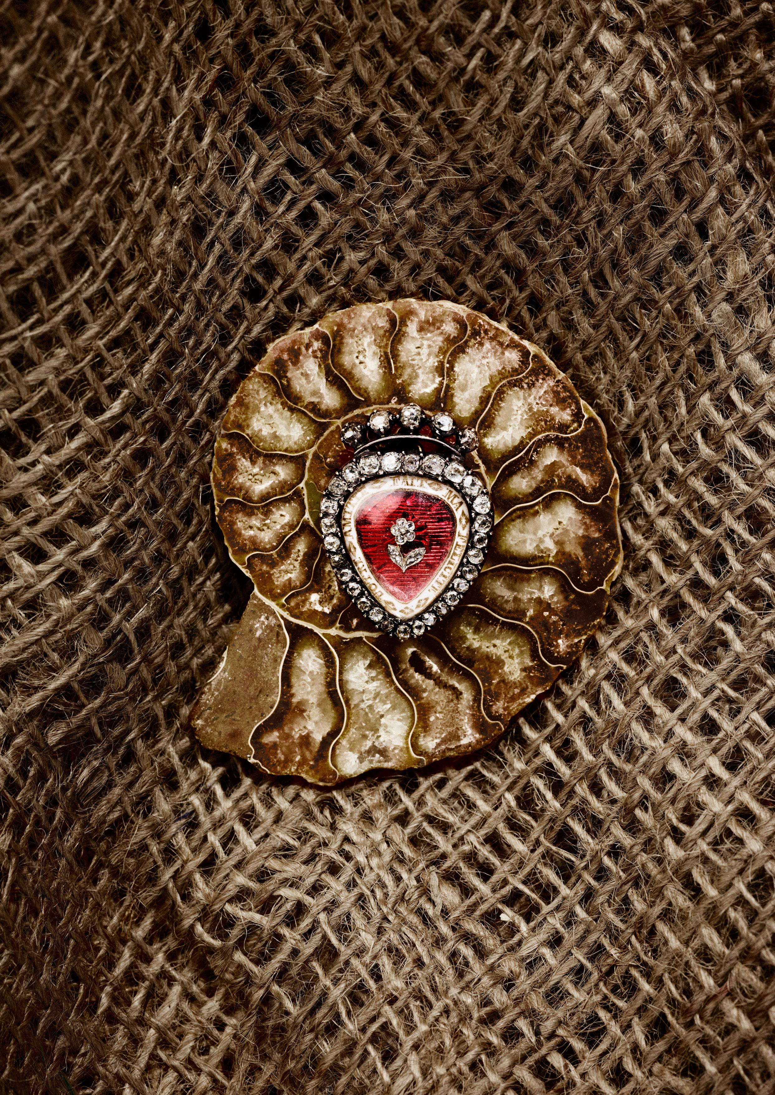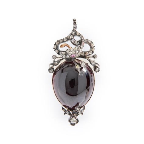 The pear-shaped cabochon garnet surmounted by a coiled-snake set with rose-cut diamonds and a cabochon ruby eye, glazed panel to reverse, unmarked
