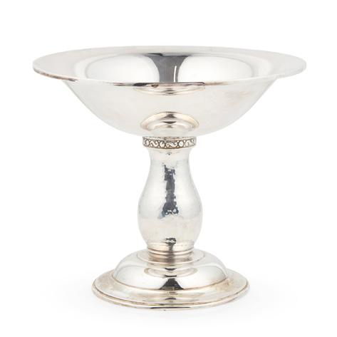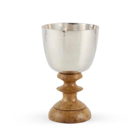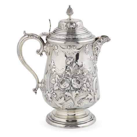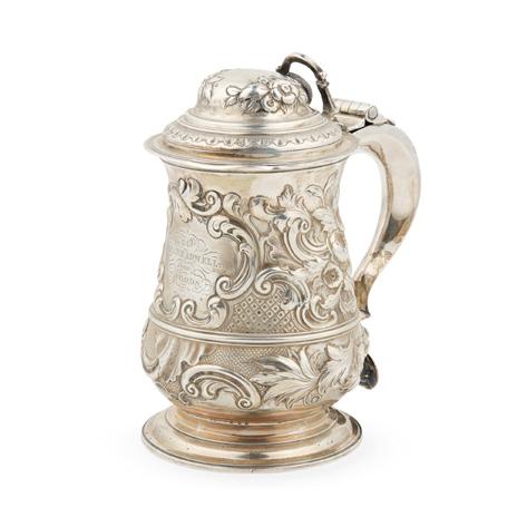 Modelled as an early Georgian covered tankard, with tapered sides, S-scroll handle, pierced thumbpiece, and wide spreading foot, with maker’s marks and stamped STERLING 6710