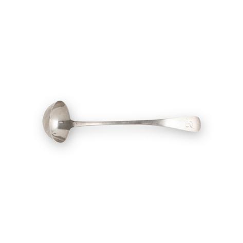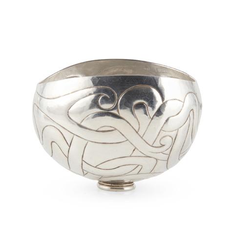The hemi-spherical bowl decorated with a white enamel ground, with yellow and green enamel foliate cloisonnŽ enamel, the swing-handle similarly decorated; together with a matching spoon, similarly decorated (2) 11cm diameter of bowl, 6.4oz, 14.5cm long 0.8oz