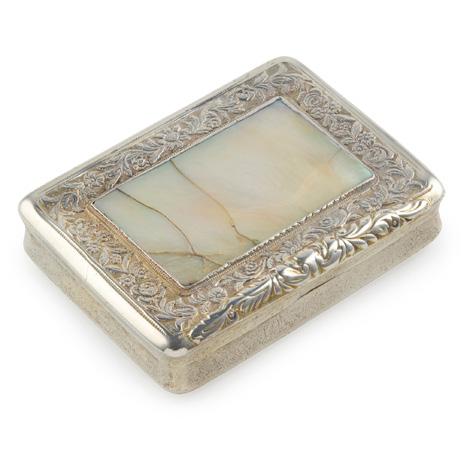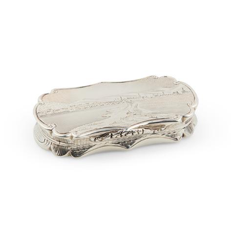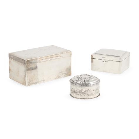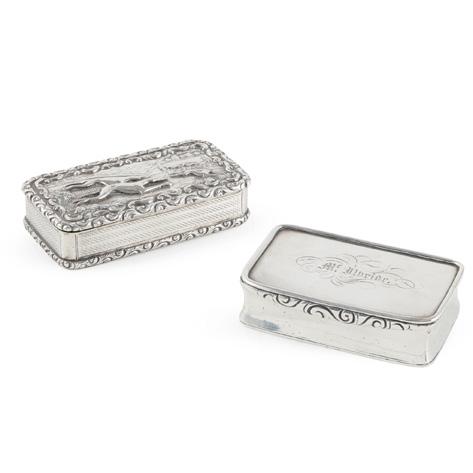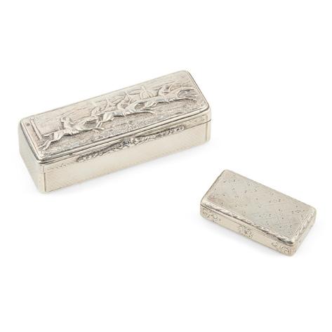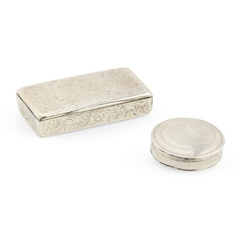 Of rectangular outline, all over engraved scroll decoration; together with a Dutch pill box, of circular outline, brightcut engraved decoration throughout (2)