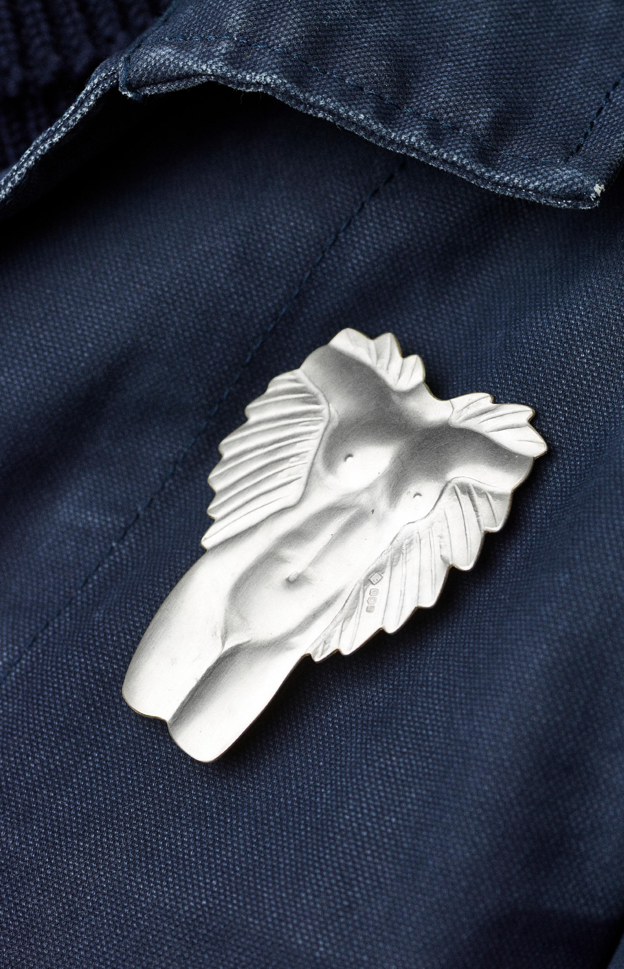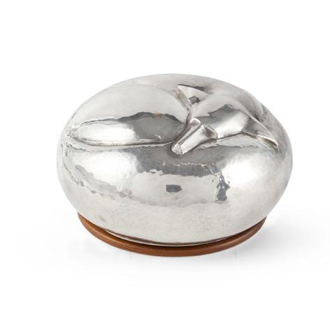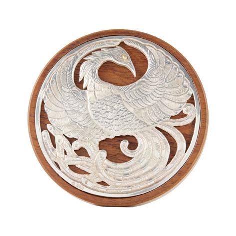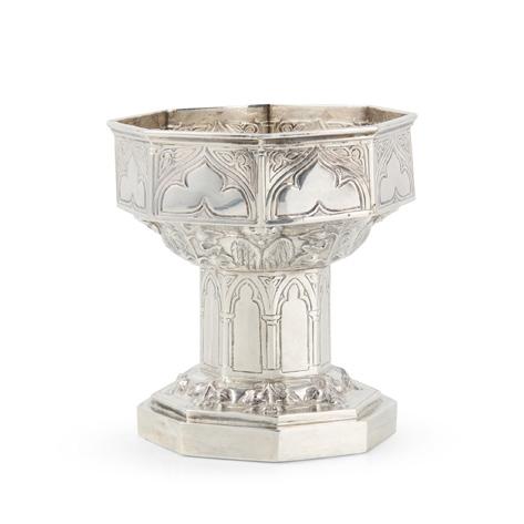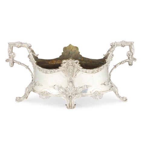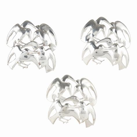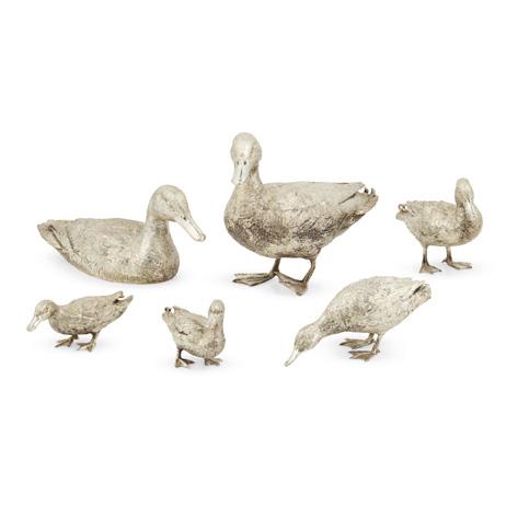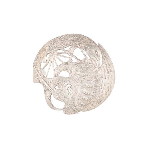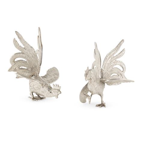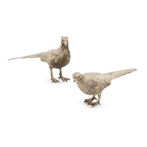 Modelled naturalistically, the detachable pierced head with coloured glass eyes, the body chased with feathers, gilt beak and gilt interior