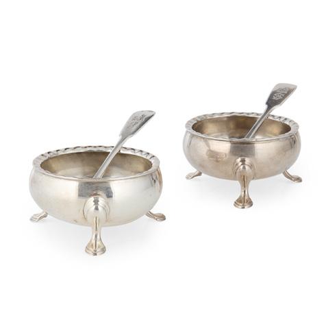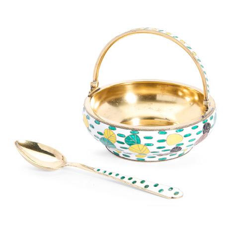 A 20TH CENTURY SOVIET ERA RUSSIAN SWING-HANDLED ENAMEL SALT CELLAR AND SPOON