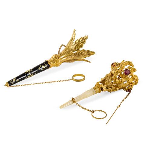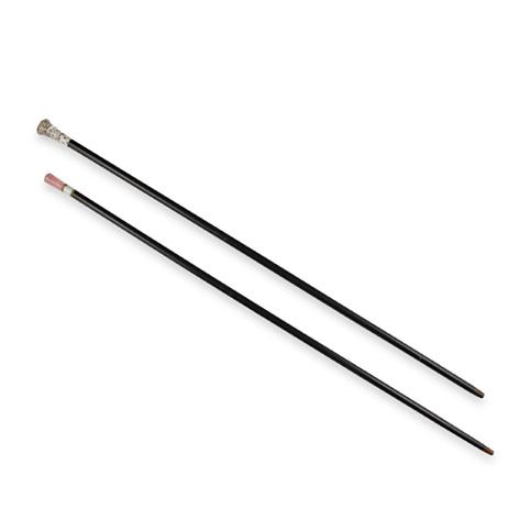 The flared terminal of pink guillochŽ enamel with pink bow and floral decoration, the border set with a row of pearls, to a silver collar, and tapered ebonised stick; together with another, the flared rock crystal terminal set in a harlequin pattern of collet set rubies, the white enamel collar also set with rubies in a similar fashion, to a tapered ebonised stick (2)