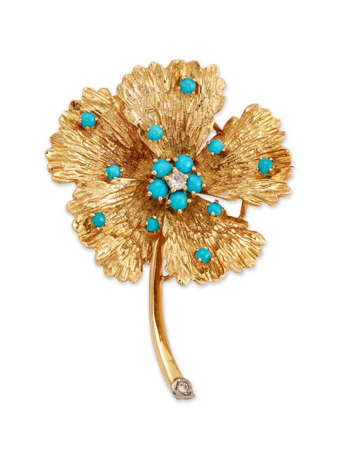 A GOLD, TURQUOISE AND DIAMOND BROOCH, BY