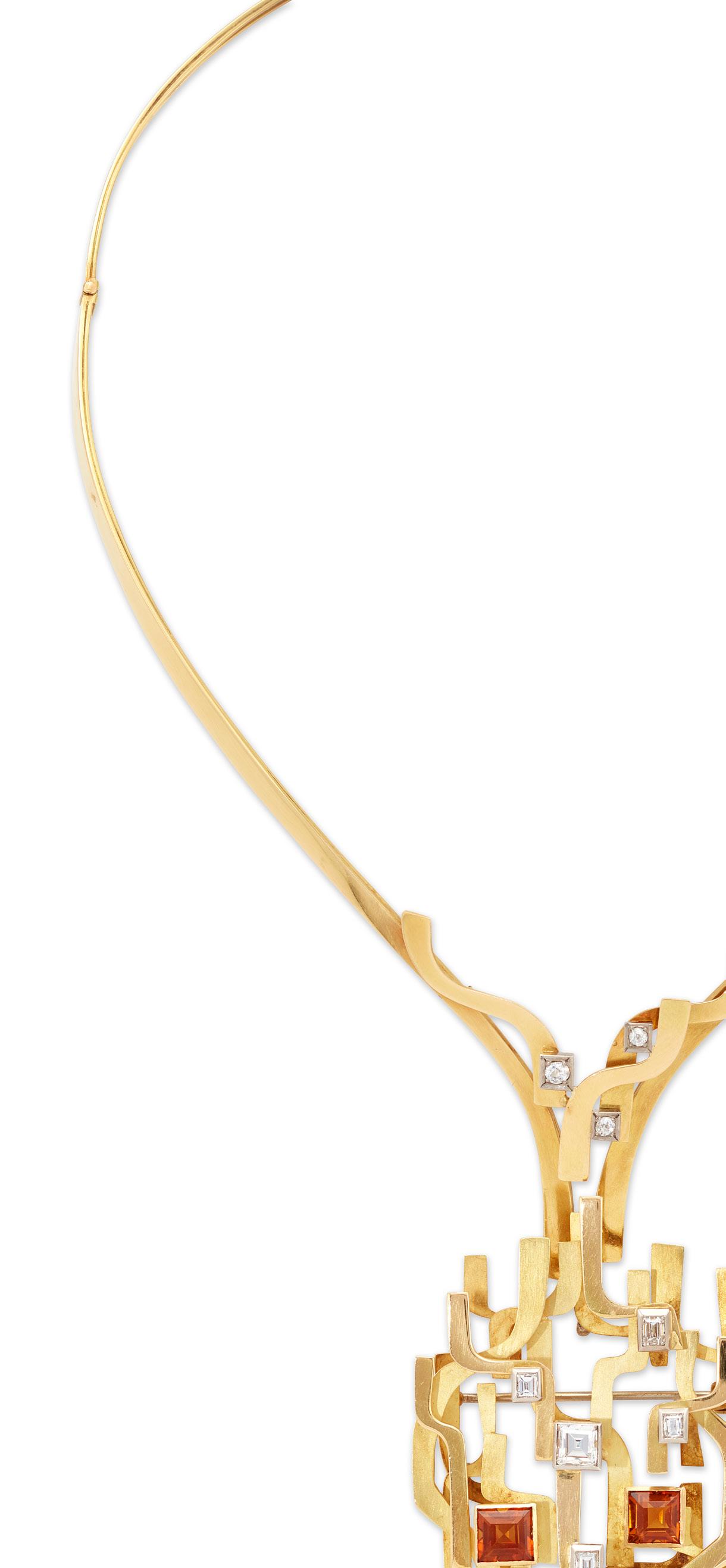 Gilian Packard’s use of rough rhodochrosite in her 1967 pendant (no. 28) and cometshaped brooch (1968, no. 37) demonstrate the continued use of crystals and rough in the period, as do Grima’s druzy agate pendant/brooch (1965, no. 21) and fluorite brooch (1967, no. 25). Jewellers of the period were fully engaging with the crystal form, often in subversive and playful ways. Their designs broke away from the traditional use of gem materials, contributing to the fresh ‘new look’ of British jewellery in the 1960s.