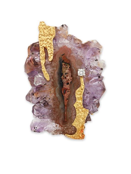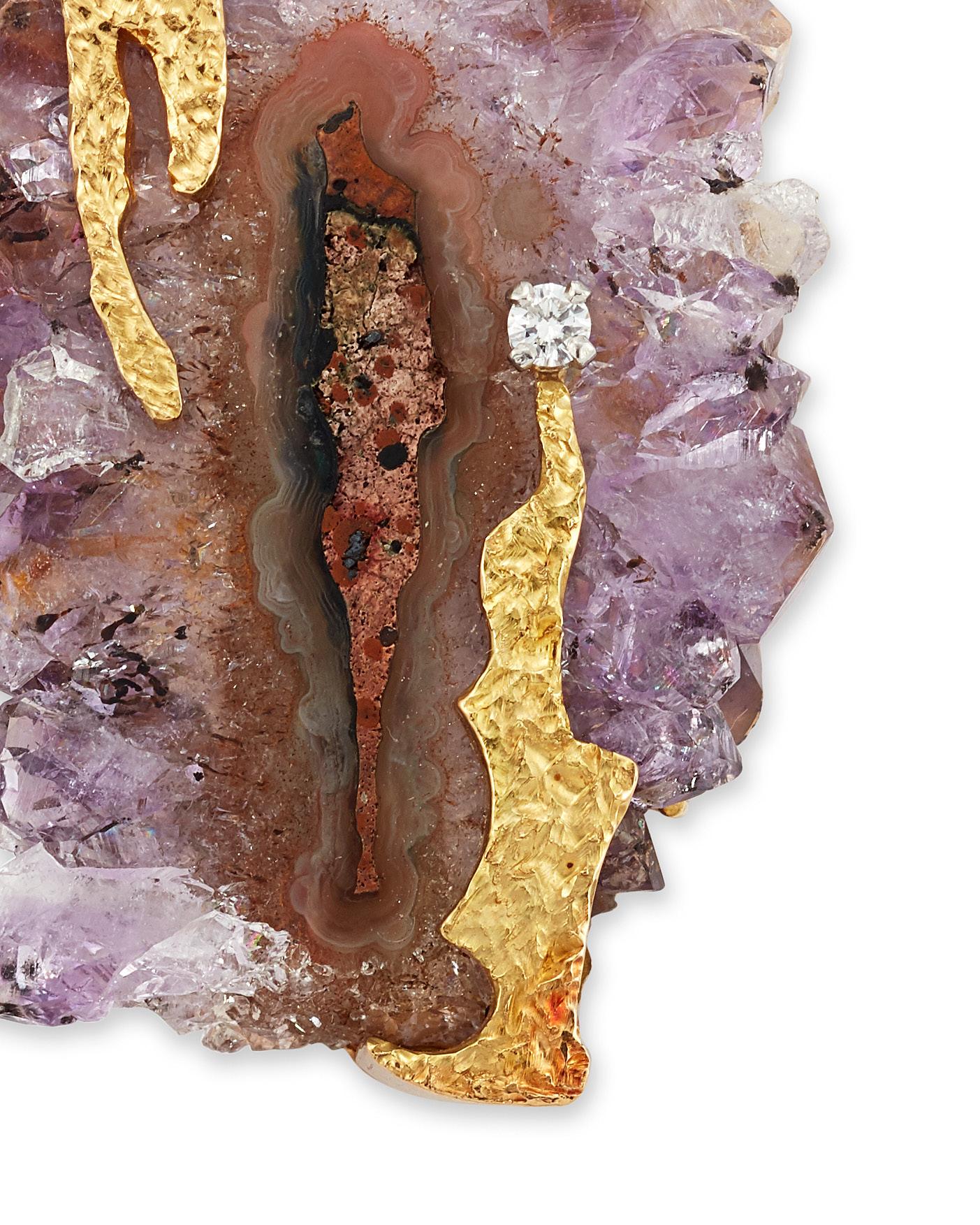 the rough amethyst crystal applied with two abstract textured panels of gold, one claw-set with a round brilliant cut diamond, London hallmarks to reverse and signed ‘GRIMA’ 4 cm. long