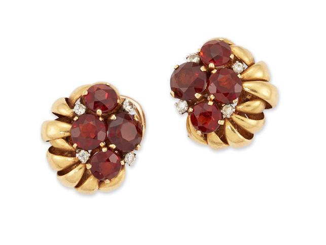 each formed as an openwork cluster of fluted curls, claw-set with ruby and diamond clusters, London hallmarks to reverse the brooch 3.5 cm. long; the earrings 2.2 cm. long