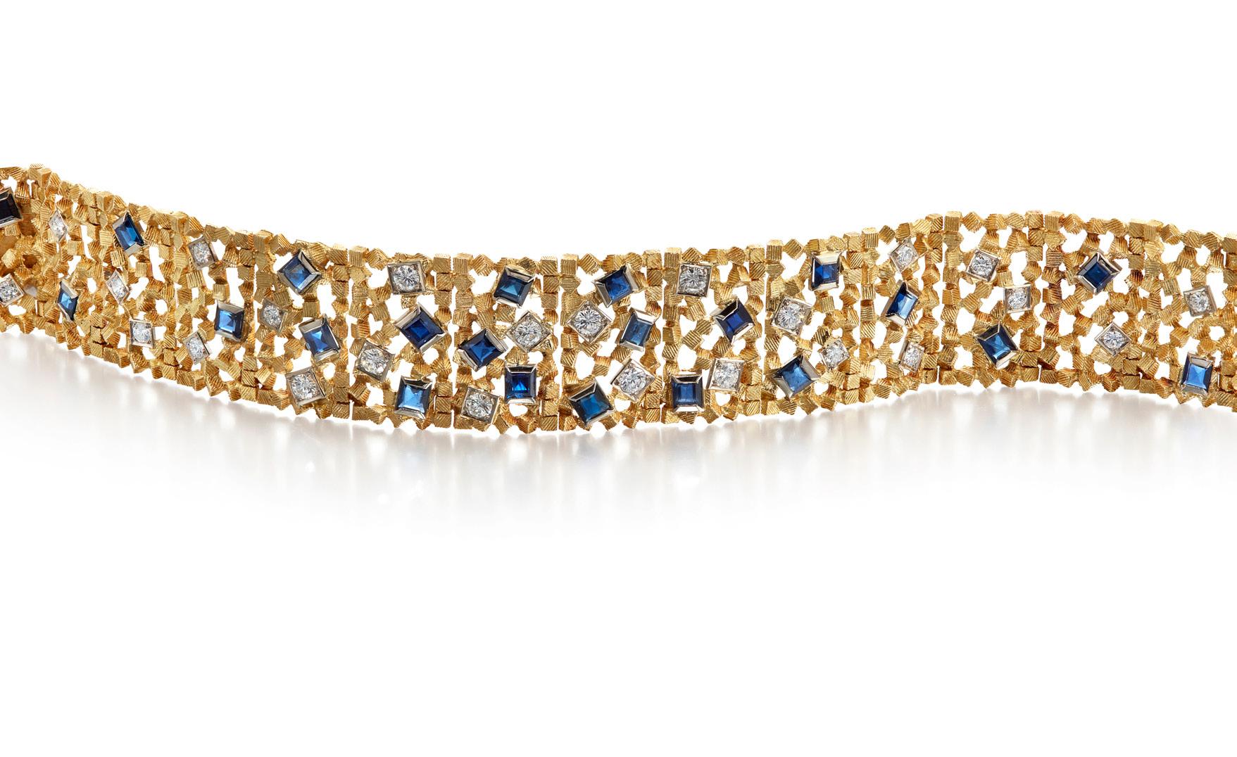 1968 each panel applied with scattered, textured gold cubes and set with squarecut sapphires and round mixed cut diamonds, London hallmarks to clasp 16.3 cm. long