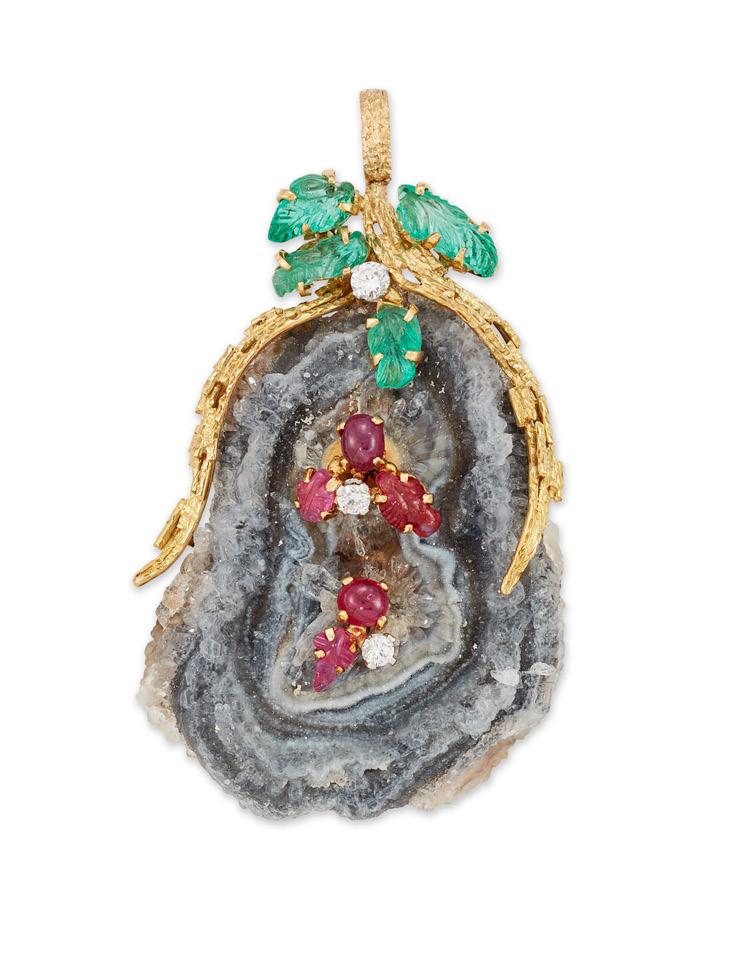 the druzy agate set with carved and cabochon rubies and emeralds, highlighted by round brilliant cut diamonds, with a textured cast foliate mount, London hallmarks on reverse 6.2 cm. long