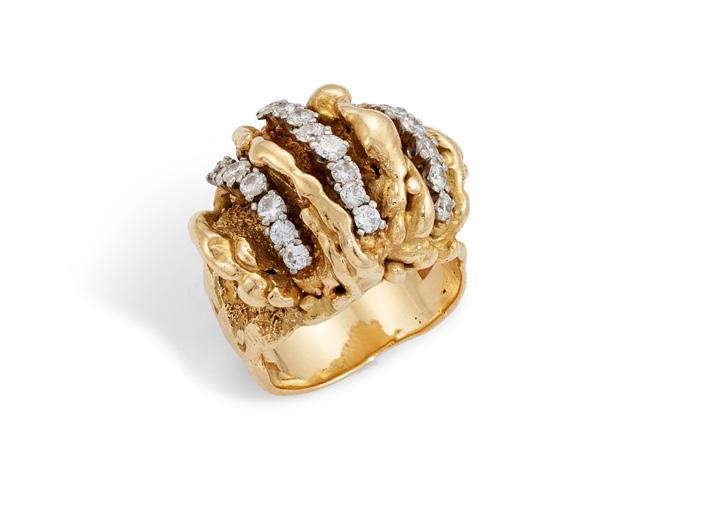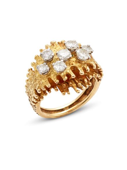 A GOLD AND DIAMONDSET RING, BY GEORG WEIL, PURCHASED 1967 cast and textured bombé abstract form claw-set with seven round brilliant cut diamonds, to a polished hoop