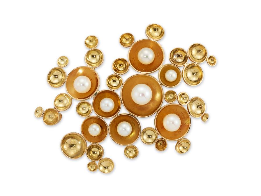 A GOLD AND PEARL-SET BROOCH, BY DAVID THOMAS, 1965 formed as a cluster of hemispherical gold cups, some centred by a cultured pearl, London hallmarks to reverse 5.3 cm. long