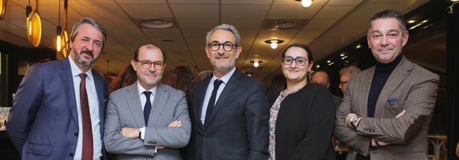 Maître Hubert Mortemard de Boisse (Soulier Bunch Avocats), futur bâtonnier 2026, Maître Vincent Medail (Lamy Lexel), président de l'ACE-Avocats Ensemble Lyon, Maître Alban PoussetBougère (CVS Avocat), bâtonnier de l'Ordre des avocats de Lyon, Maître Sara Kebir, vice-bâtonnière de l'Ordre des avocats de Lyon et Maître Olivier Costa (Ad Valoria), nouveau président de l'ACE 2026