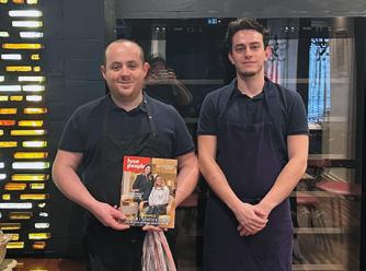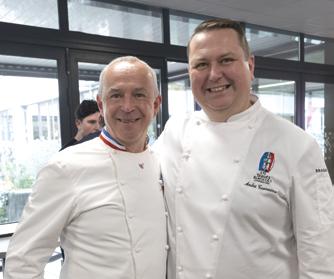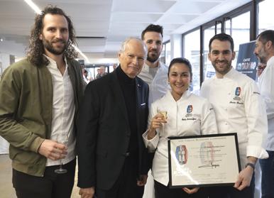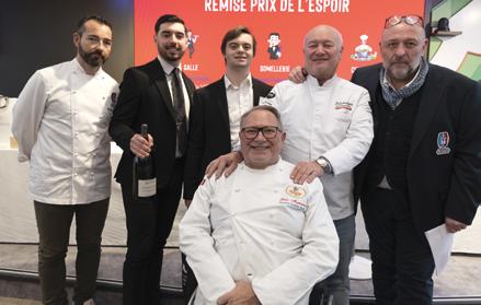 Le parrain de la promotion, Gilles Maysonnave, entouré de Yaroslav Ruzhylo espoir en cuisine, représenté par Olivier Reverdy (La mère Brazier), Owen Barranco espoir Sommelier (Restaurant Mirazur), Maxime Payet meilleur espoir en Salle (La cantine du Village) avec son chef Pierre-Alain Hébrard et Dominic Moreaud (Talent Pluriel by Baptiste Pignol)