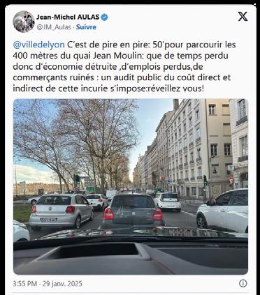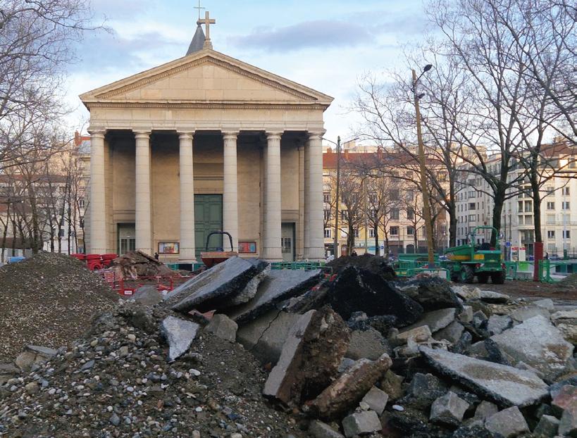 cène de désolation depuis plusieurs jours devant et contre l’église SaintPothin. Places de stationnement supprimées, travaux jusqu’à l’été 2026, les écologistes pourrissent la vie du quartier. La scène pourrait prêter à sourire : l’église Saint-Pothin voit sa place mourir, avant que celle-ci ne ressuscite. Mais en attendant, le paysage semble bien loin des récits bibliques. Sur place, les pelleteuses forment un balai à la mission bien définie : terminer la transformation de la place à l’horizon de l’été prochain. « Les objectifs de la modification de cet espace public sont de renforcer la végétation », écrit ainsi la Métropole pour présenter ce projet à 3,7 millions d’euros, financé à hauteur de 1,9 million d'euros par la Ville de Lyon. Pourtant, la place Edgar Quinet ne semblait pas être la plus mal lotie. Parents et enfants disposaient déjà d’un espace sécurisé et clôturé, de zones d’ombre et de pelouses que la Métropole et la Ville de Lyon auraient pu se contenter de réengazonner. Toutefois, une telle option ne semble manifestement pas être à la hauteur des espérances écologistes, ces