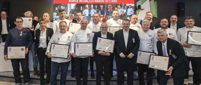 dans de nombreux étoilés. Chez la Mère Léa, lundi 19 janvier 2026, Jean-Marc Tachet fut donc distingué devant un parterre de chefs, journalistes, élus et fournisseurs. Danielle Crost, du restaurant Les Castors à Crémieu, eut l’amicale mission de dresser le portrait de ce pro des saveurs. Exercice difficile quand cinq pages ne suffisent pas à retracer le parcours d’un « couteau suisse » : formateur, consultant, créateur de concepts innovants. Le chef Christian Têtedoie et sa brigade du quai des Célestins signaient le menu du cocktail déjeunatoire de son ami. On s’en doute, chez Léa la tradition lyonnaise fut respectée entre saucisson brioché, quenelle de brochet, pâtés en croûte et convivialité.