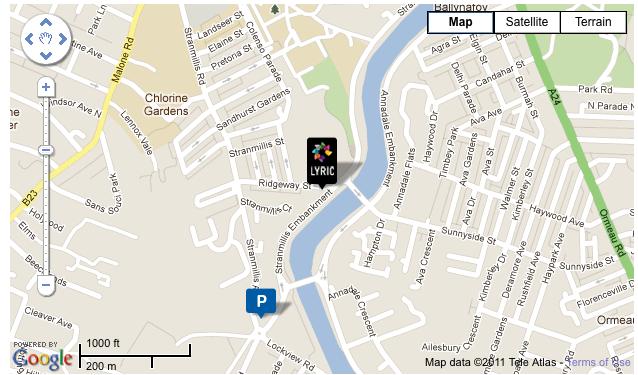 i s oad. T he t heat re i s at t he bot tom of dgeway St reet where it meet s St ra n m ill i s mba n k ment be side t he R iver L aga n.