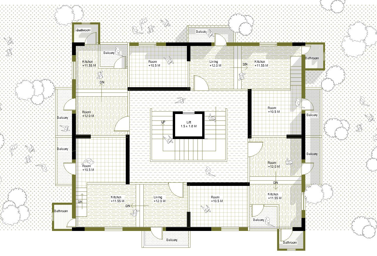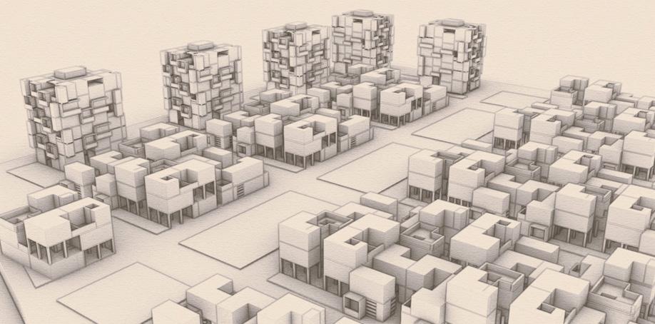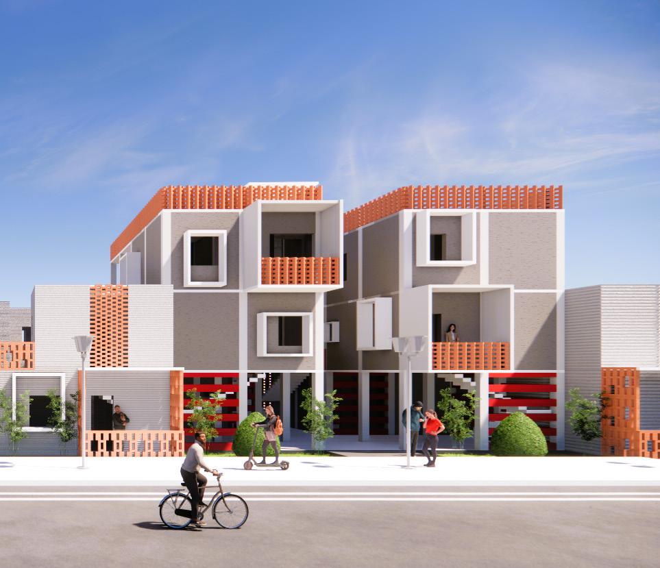 In order to resolve the above-mentioned issues, the thesis proposes a combination of low- and mid-rise housing units. This combination would not only help in breaking the problems raised due to rising population of the country but also give the occupants various housing options to choose from. The low-rise units are placed in a zig zag pattern on the site. This zig zag pattern creates a green interactive space either in front of the modules or at the back. The pattern also ensures cross ventilation throughout the site. The four the module type caters to the above-mentioned factors while also providing the occupants a chance to expand if needed in the future. The low-rise units are designed using a 3 x 3-meter grid. The grid helps in answering the matters related to flexibility and the area. The mid-rise units are being designed by alternating rooms half a floor in height. This change in level helps in greater cross ventilation while consuming lesser area. Additionally, a huge spine of green recreational and community spaces is proposed in the centre. The new design typology could help in creating a decent space equipped with all the basic amenities for the weaker sections of the society; thus, giving them an equal opportunity to live a healthy lifestyle.