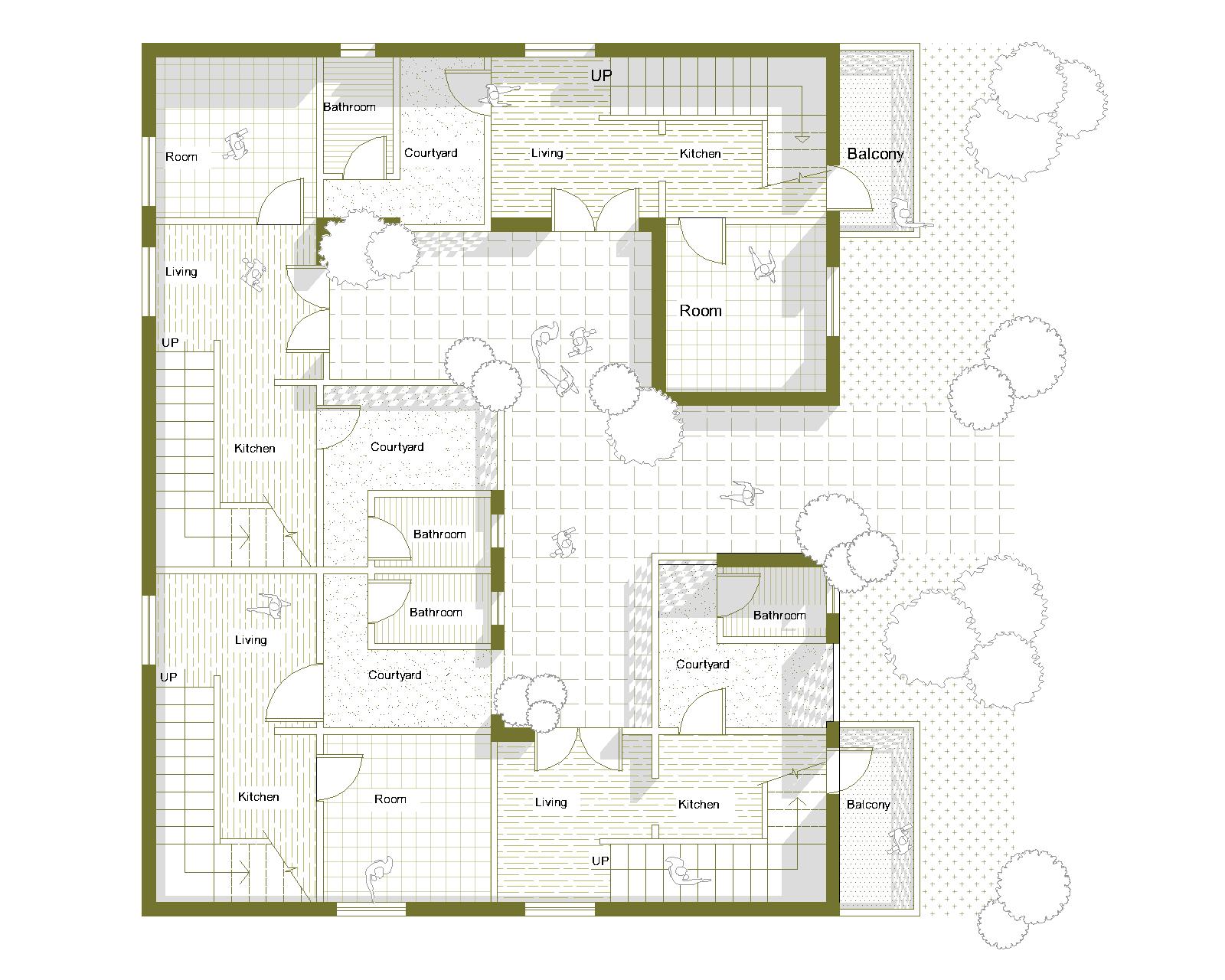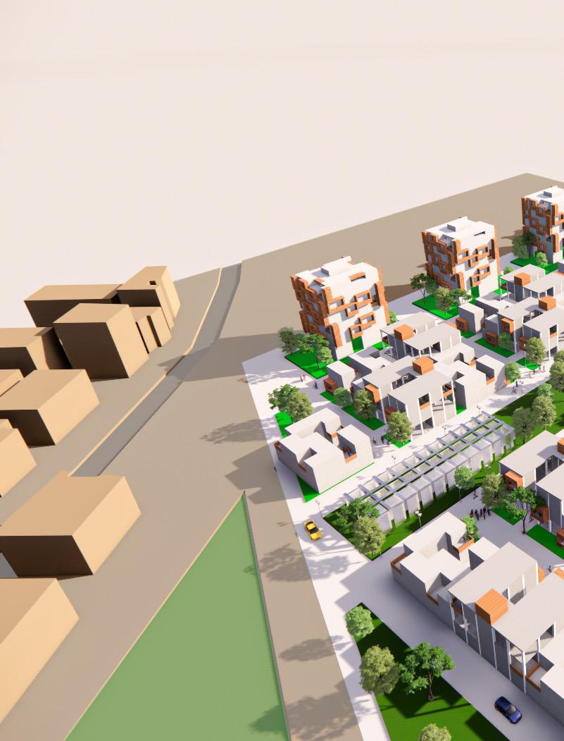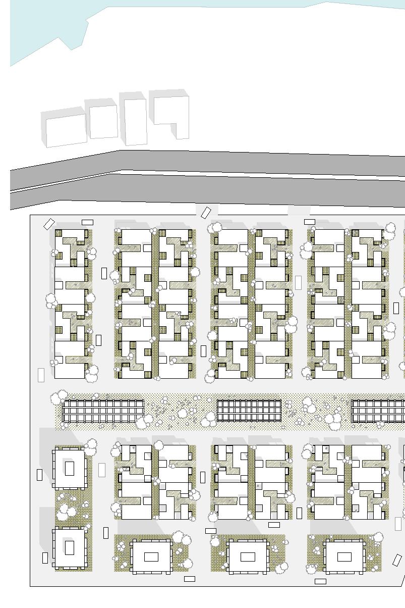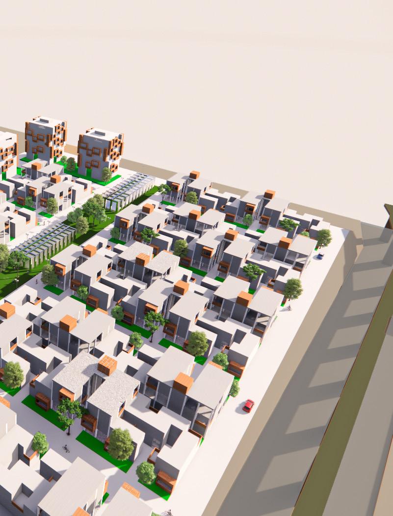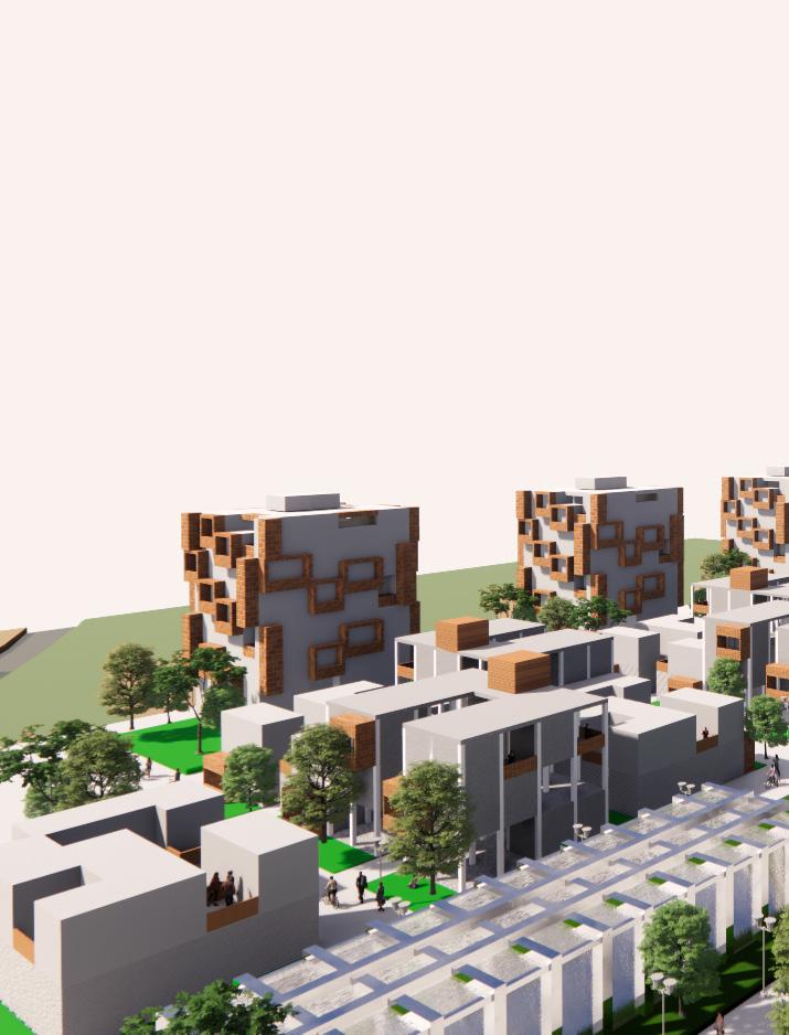 The thesis focuses on designing a combination of low and mid rise housing units adorned with green spaces. The most important principles in housing are incrementality, open-to-sky spaces, equity and a strong sense of community. The design tries to slowly merge the hardscape into the softscape thereby not distinctly separating one from the other. Hence, the basic element which is the house is equipped with an open to sky space which is an essential aspect for an Indian family. In this manner four pair of housing units are grouped together along a common court. This common court leads to a shared green space thus leading way into shaded alleyways to the green central spine which is the focal point of the site. The central spine consists of 3 community buildings incorporating farmers market, day care centre, restaurants, grocery shops and many more It is these in-between community spaces that help people interact with each other and make the space livelier. The streets are laid down in a grid pattern that help in achieving ease of vehicular and pedestrian movement. Additionally, the grid pattern provided greater flexibility in movement of both the people and the air. Moreover, the low-rise high-density housing design also considered the local climatic conditions of the city. Since, Nagpur has a temperate climate, the temperatures go up to as high as 120 F in summer months. Therefore, all the low rises are placed on the front portion on the site and the mid rises on the rear part. So that the mid rises could provide shade to the street and low rise houses in front of it. Placing the units in this way has also helped in not obstructing the wind flow. Additionally, with this placement mid rise apartments can enjoy the beautiful view of the lake located in front of the site. The site consists of 2 and 3 storeys low rise clusters. This variation in height helps in breaking the monotonous facade and also helps in achieving maximum natural air circulation and sunlight to all the units.