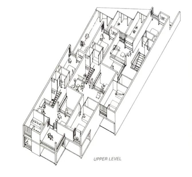 The main idea of the Previ design consists of a series of row houses placed in a zig zag manner. The zig zag placement of the housing units paved way for more usable area for the occupants. Correa used 3-meter-wide bays whose narrowness was relieved by fluctuating the width of individual bays wherever necessary. Additionally, the bays provided greater flexibility in movement of both the people and the air.
