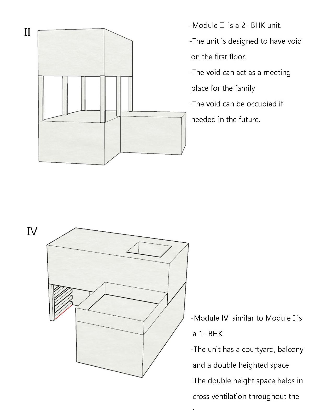 The design consists of two types of clusters. Both the clusters are designed using a 3 x 3-meter grid. All the units in the cluster have a balcony or a courtyard attached along with a space to expand in the future. Both the clusters consist of 1 - BHK (bedroom, hall & kitchen), 2 - BHK and 3 - BHK apartments. Cluster - I is a combination of module type I apartment units. Whereas, cluster - II is a combination of module types two, three and four. Cluster - I is a two-storey block and on the other hand cluster - II is a three-storey block.