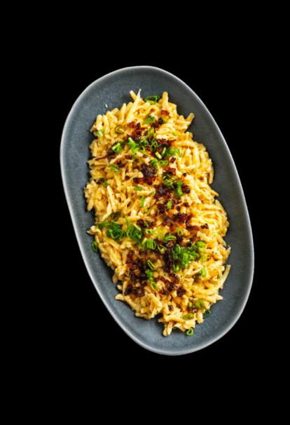 Cuire 500 g de spätzle souabes dans de l’eau salée bouillante. Entre-temps, couper 4 oignons nouveaux en rouelles, réserver un peu de vert et faire rissoler le reste dans 2 cs de beurre. À l'aide d’une écumoire, prélever les pâtes et les mettre dans une jatte avec 2 cs de beurre et 200 g d’Appenzeller râpé. Mélanger jusqu’à ce que le fromage tire des fils. Servir les spätzli avec les oignons nouveaux rissolés, ajouter l’oignon réservé et poivrer. Prix pour 4 personnes: env. Fr. 8.60 La recette se trouve sur migusto.migros.ch