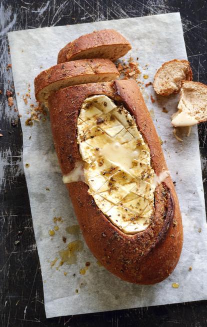 Caprice des Dieux à 300 g auf ein Ruchbrot à 500 g legen. Das Brot von oben dem Käse entlang einschneiden und aushöhlen, sodass der Käse hineinpasst. 30 g Butter schmelzen, mit 1 TL Kräutersalz würzen. Brot mit etwas Butter innen und aussen bestreichen, Käse hineinlegen, mit einem Messer etwas einschneiden. Restliche Butter darübergiessen. In der Ofenmitte ca. 15 Minuten backen, bis der Käse geschmolzen ist. Sofort servieren.