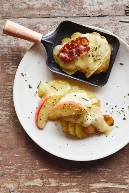 800 g Raclette-Kartoffeln in etwas Wasser ca. 20 Minuten knapp weich kochen. Kartoffeln in Scheiben à ca. 5 mm schneiden. 2 Äpfel halbieren, entkernen und ungeschält in Schnitze schneiden. 2–3 Kartoffelscheiben in Raclettepfännli legen. Mit Käse- und Apfelscheiben belegen. Einige Kapern und etwas Rosmarin darauf verteilen. Unter dem Grill ca. 2 Minuten überbacken, bis der Käse geschmolzen ist. Mit Pfeffer bestreuen. Mehr Rezepte mit Raclettekäse auf migusto.ch