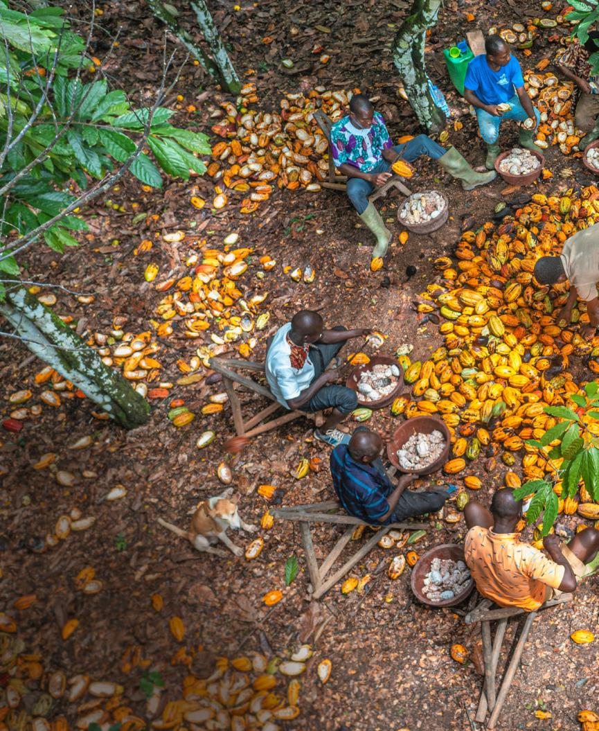 Le moment Migros En Côte d’Ivoire, des producteurs de cacao cassent les cabosses et en extraient les fèves. La plantation dans laquelle ils travaillent appartient à la coopérative Necaayo, qui approvisionne Migros en cacao brut depuis 2012.