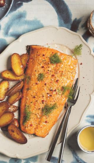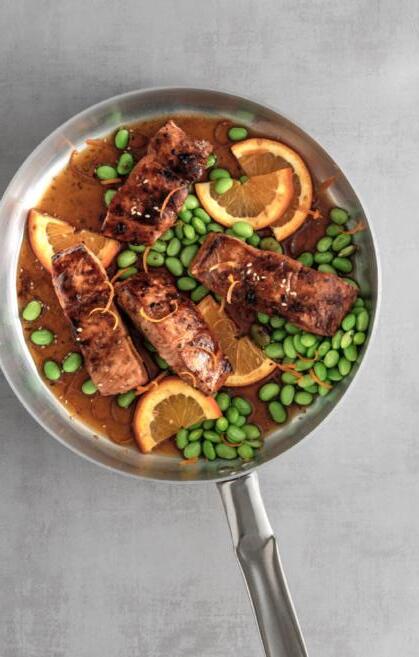 4 Lachsfilets à ca. 120 g mit 0,5 dl Teriyaki-Sauce 10 Minuten marinieren. Von einer Orange Zesten abziehen, beiseitestellen. Frucht auspressen. Eine weitere Orange halbieren, in Scheiben schneiden. Lachs in 2 EL Kokosöl bei hoher Temperatur beidseitig scharf anbraten. Herausnehmen und beiseitestellen. Temperatur reduzieren, Orangensaft und 200 g tiefgekühlte geschälte Edamame in derselben Pfanne 5 Minuten köcheln lassen. Lachs, Orangenscheiben und 1 dl Teriyaki-Sauce beigeben. Zugedeckt 3–4 Minuten fertig garen. Orangenzesten darüberstreuen. Mehr Lachsrezepte auf migusto.ch