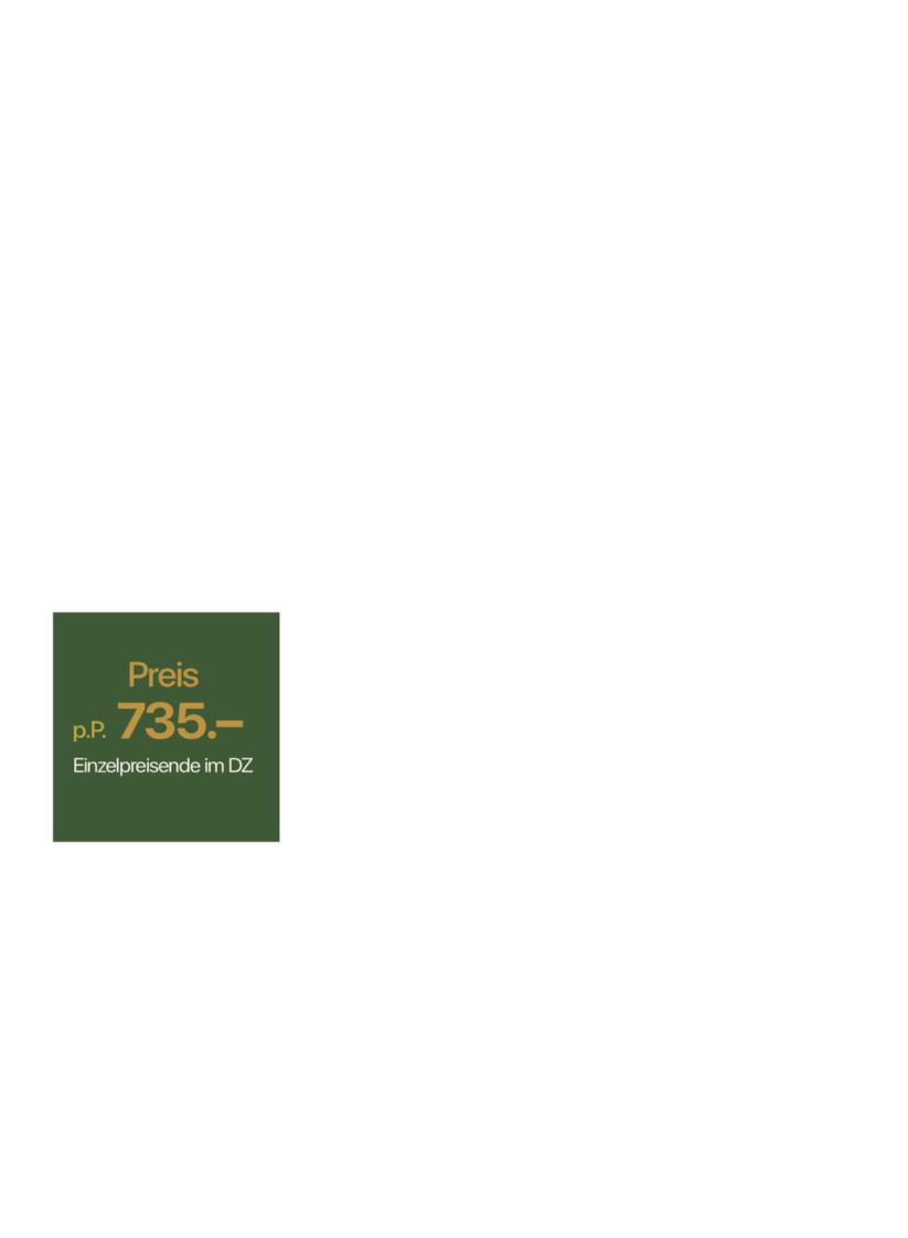 Zusätzlich wählbar/nicht inbegriffen Einzelzimmerzuschlag: Fr. 180.Saisonzuschlag Abreisen 10.5. & 20.9.: Fr. 50.Buchungsgebühr: Fr. 24.- pro Person (entfällt bei Online-Buchung)