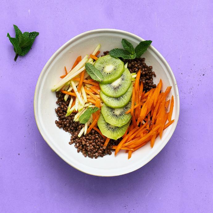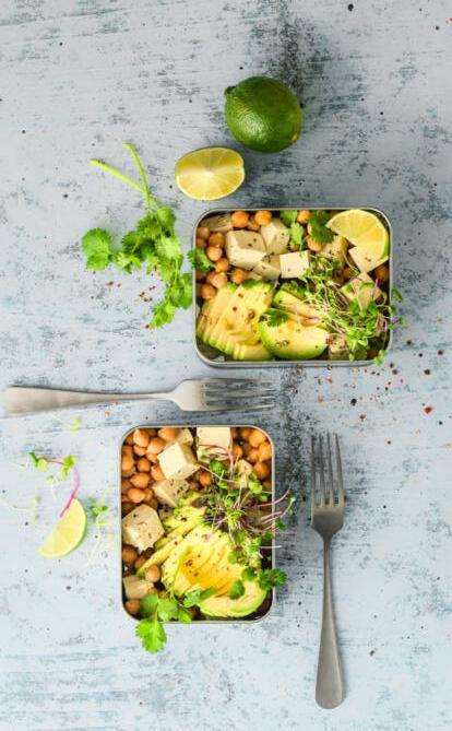 Rincer 230 g de pois chiches en boîte sous l’eau tiède et bien les égoutter. Couper l’avocat en deux, ôter le noyau. Retirer la chair avec une cuillère et la détailler en tranches. Couper 115 g de tofu en dés. Partager 1 citron vert en deux et presser le jus par-dessus. Saler et poivrer. Dresser le tout avec 10 g de pousses. Servir avec de la coriandre selon les goûts.