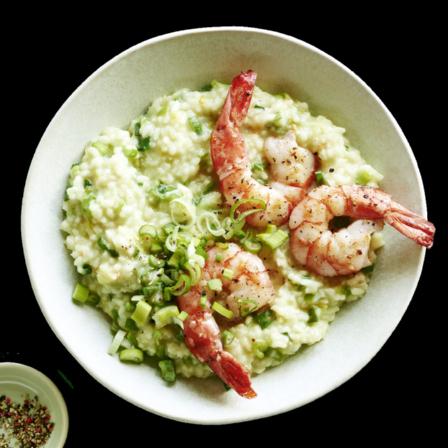 Couper le vert de deux bottes d’oignons nouveaux et le réserver. Hacher fin le reste. Faire fondre 2 cs de beurre dans une casserole et y faire suer les oignons. Ajouter 300 g de riz pour risotto et le faire revenir jusqu’à transparence. Y verser 4 dl de bouillon de légumes. Laisser frémir env. 15 min en remuant de temps en temps. Ajouter peu à peu 4 dl de bouillon. Râper 60 g de parmesan sur le risotto. Couper le vert des oignons nouveaux en rouelles et les ajouter. Saler et poivrer 12 crevettes. Les saisir env. 2 min de tous les côtés dans l’huile. Les servir avec le risotto aux oignons nouveaux.
